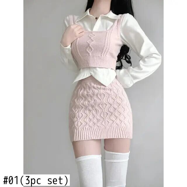 ホットガールスーツ秋セータータンクトップラップヒップショートスカート白シャツ 3 点セット ホワイト オータム 秋物