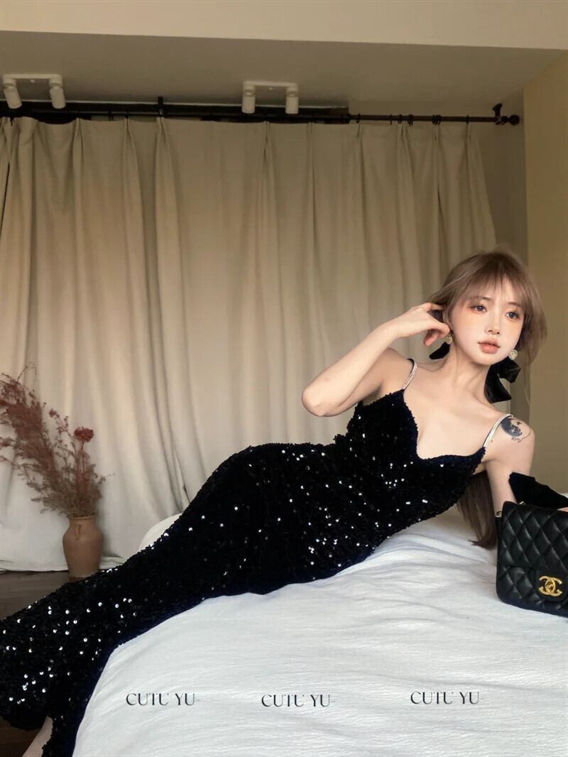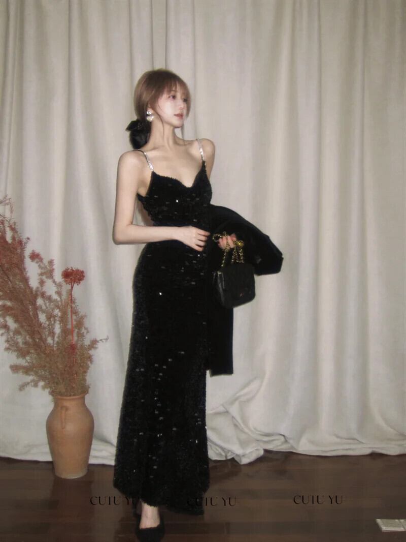 フレンチスイートホットガールセクシースパンコールサスペンダードレス冬スリムフィットベルベットフィッシュテールロングドレス 大人ガーリー スウィート キュート カジュアル ウィンター 冬物