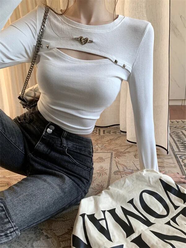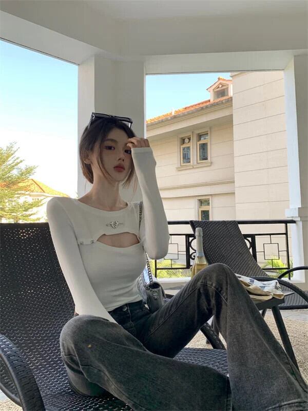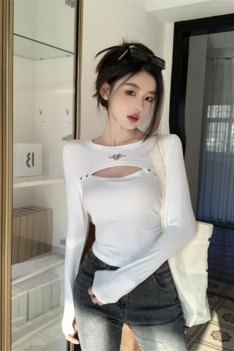甘いホットガール白スリムフィット長袖 Tシャツ O ネックアウトボトムショートシャツ ロング ホワイト 大人ガーリー スウィート キュート カジュアル Oネック