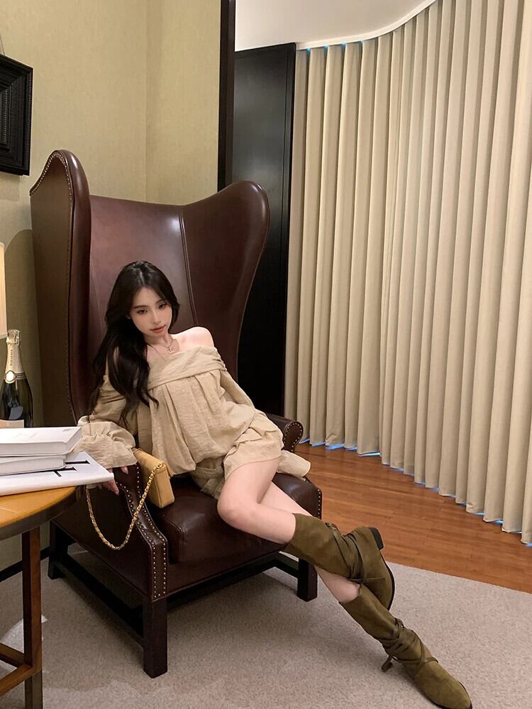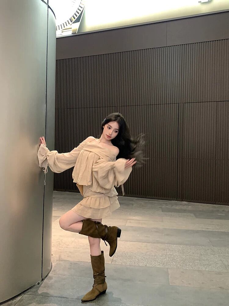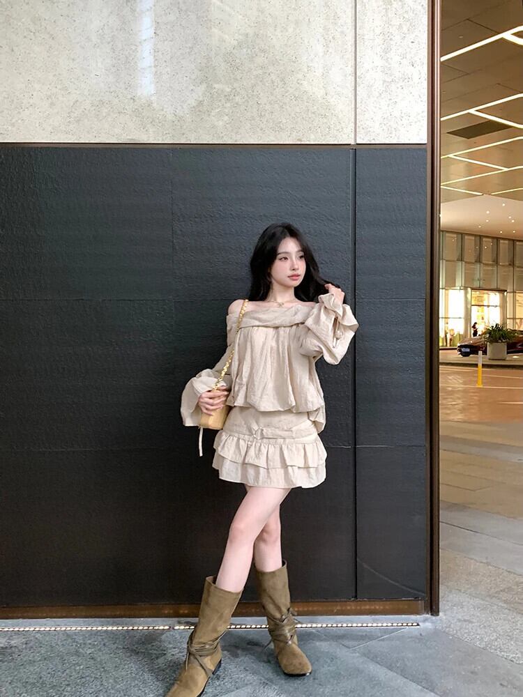 ホットガール純粋セクシースーツ春オフショルダー長袖トップフリルミニスカートツーピースセット ロング スプリング 春物 ピュア