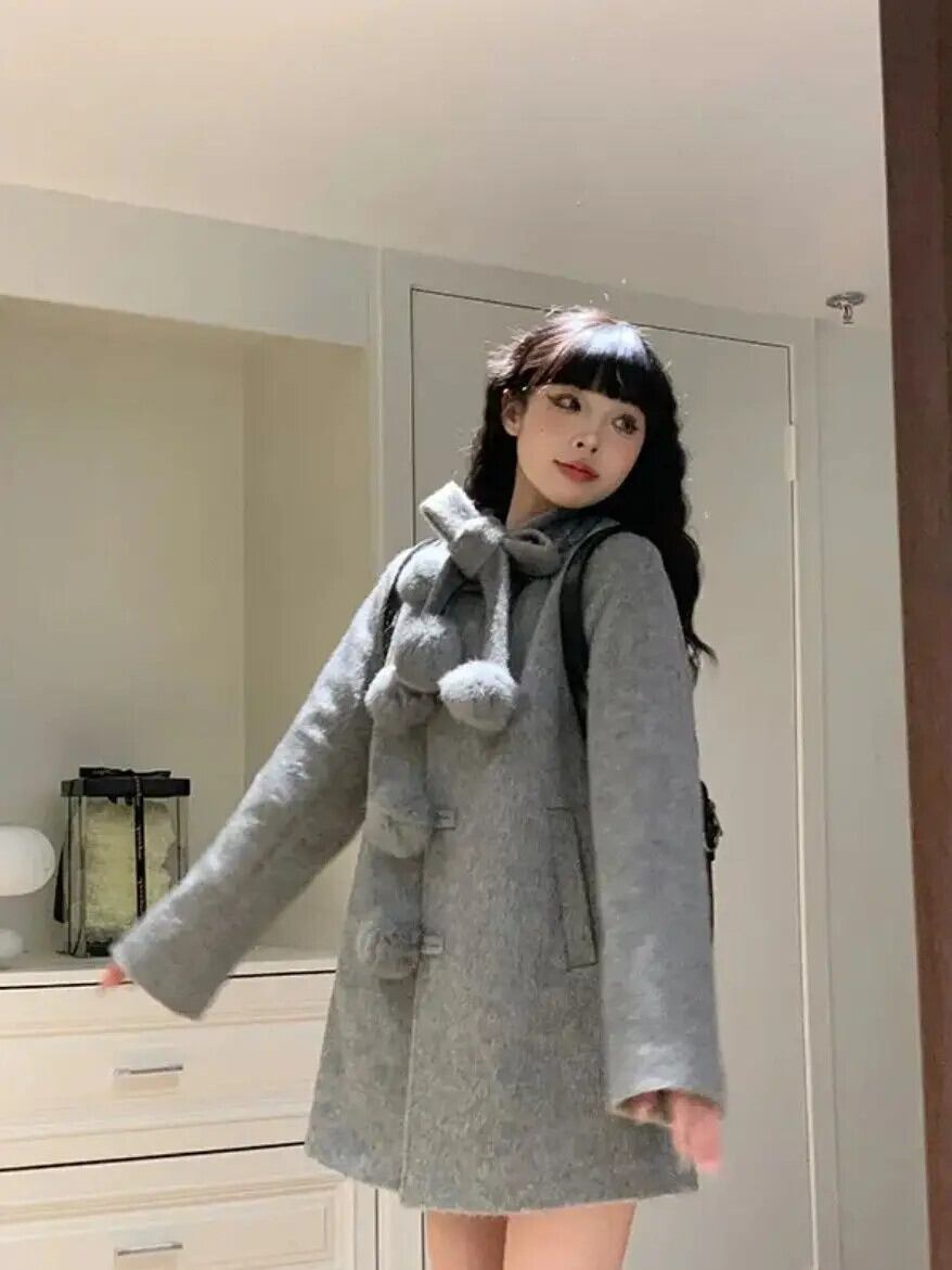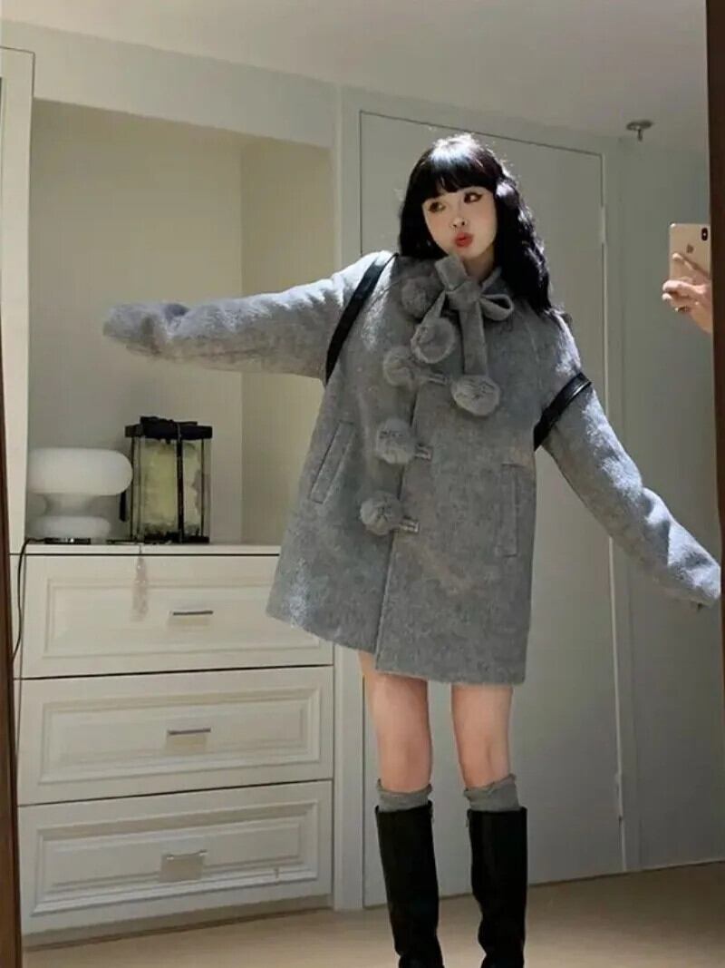 甘いホットガールレースアップウールコート冬長袖ファーボールかわいい弓ルーズコート ロング リボン 大人ガーリー スウィート キュート カジュアル ウィンター 冬物