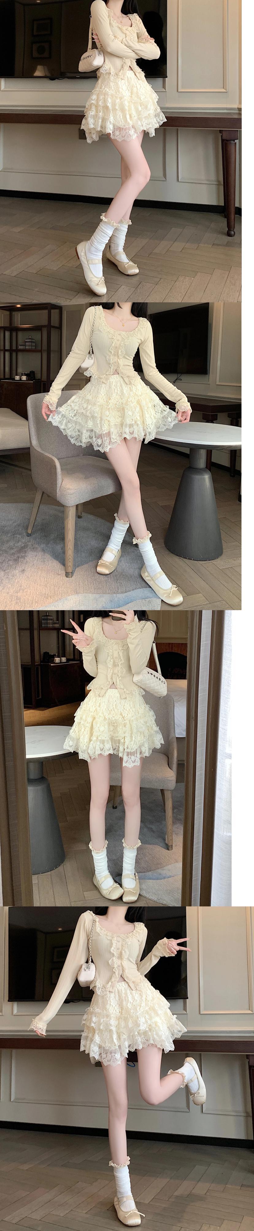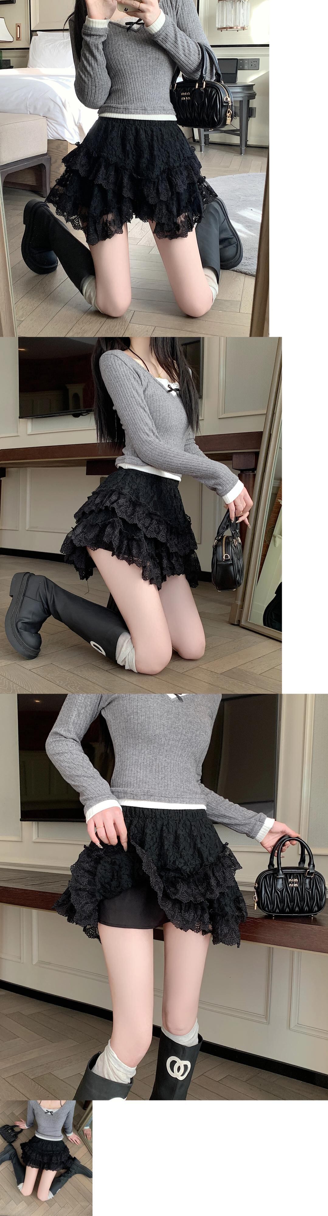甘いホットガールソリッドレースパッチワークスカート冬不規則ふわふわ A ラインウエストショートスカート 大人ガーリー スウィート キュート カジュアル ウィンター 冬物 Aライン ソリッドカラー