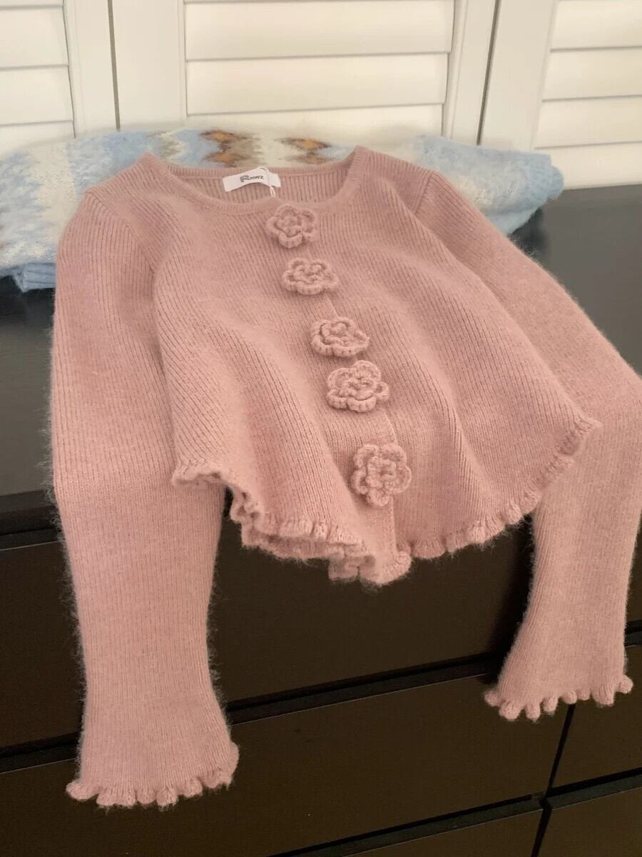 甘いホットガール不規則花ニットカーディガン秋/冬スリム O ネック長袖セーター ロング 大人ガーリー スウィート キュート カジュアル オータム 秋物 ウィンター 冬物 Oネック フラワーデザイン