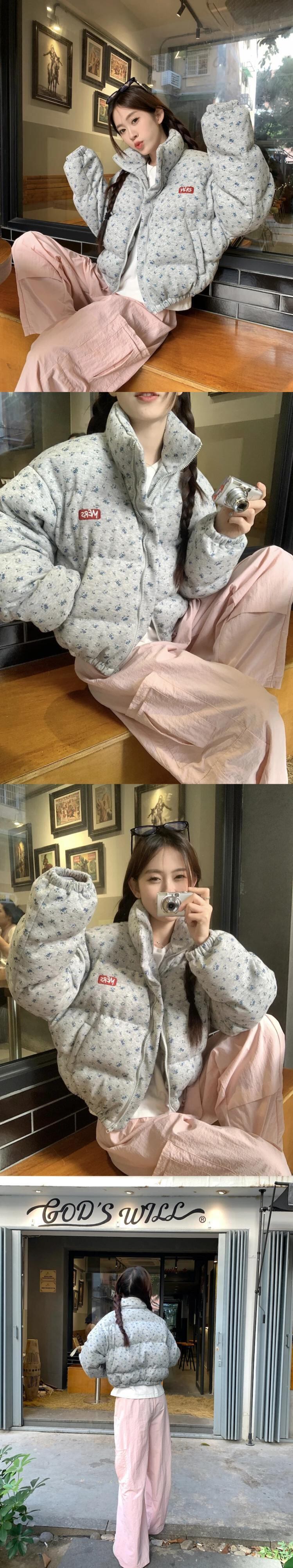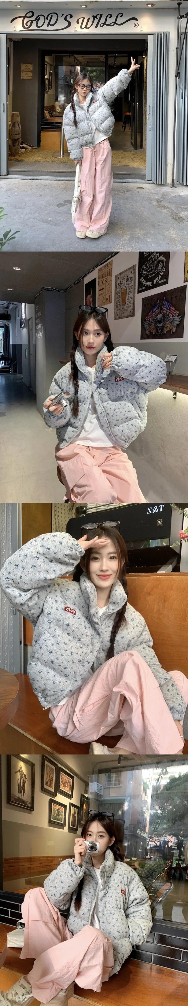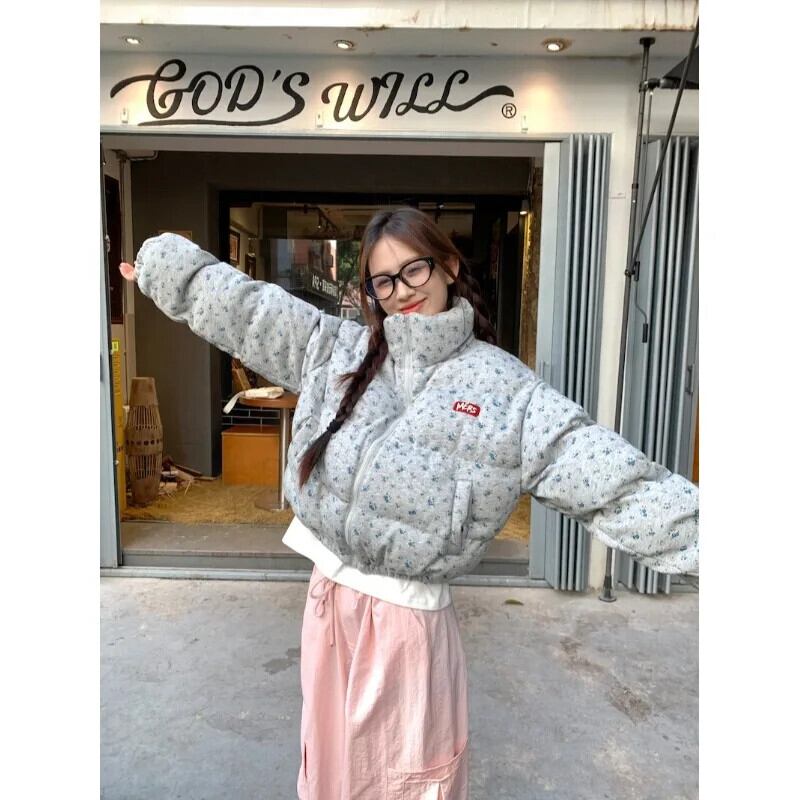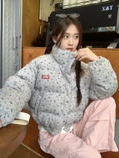 甘いホットガール花スタンドカラーコットンジャケット冬長袖ルーズフィット暖かいコットンジャケット ロング 大人ガーリー スウィート キュート カジュアル ウィンター 冬物 花柄