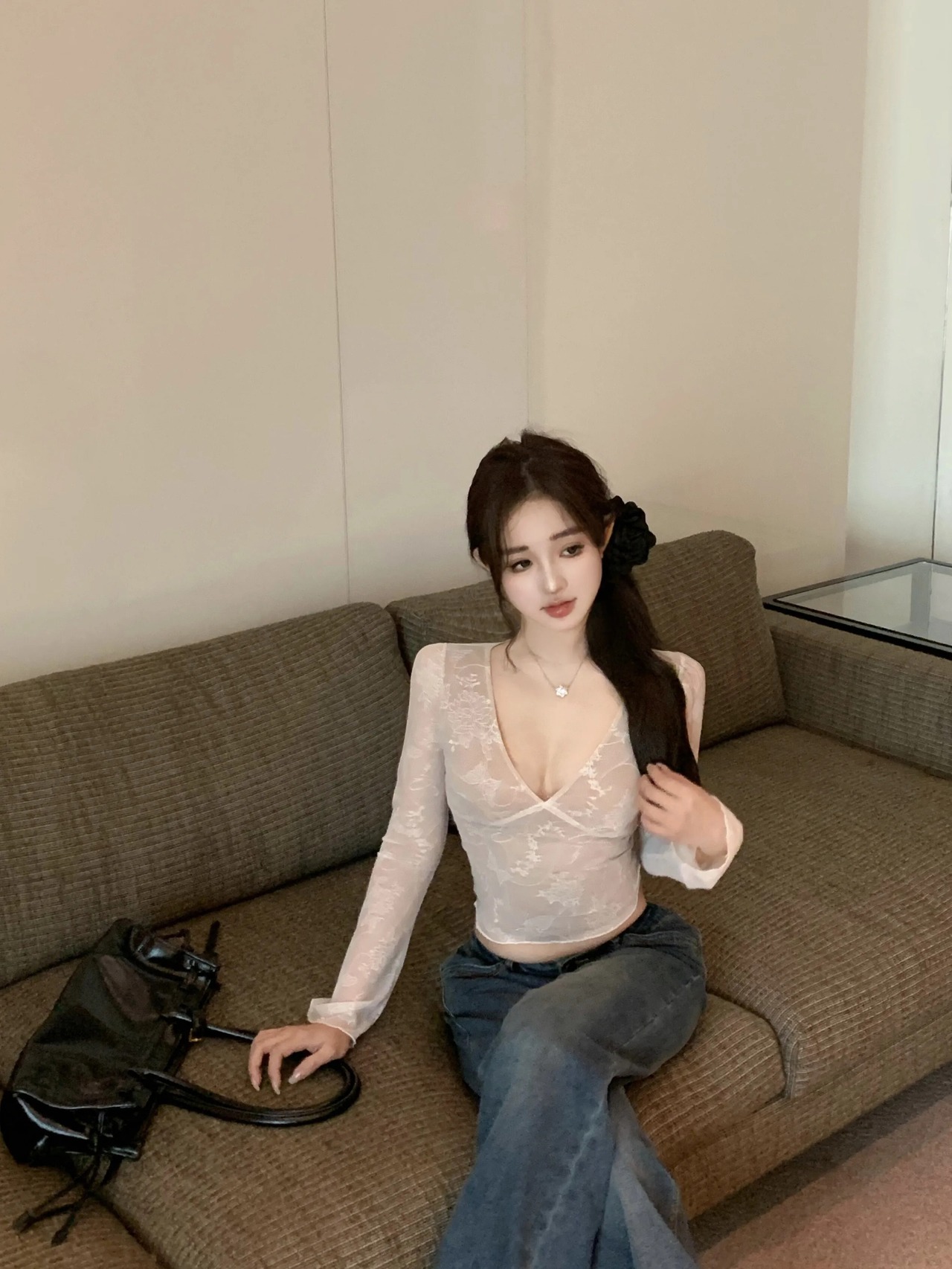 アメリカンスウィートホットガール V ネックレースシャツ春純粋セクシー透明フレアスリーブショートトップ 大人ガーリー キュート カジュアル スプリング 春物 Vネック ピュア