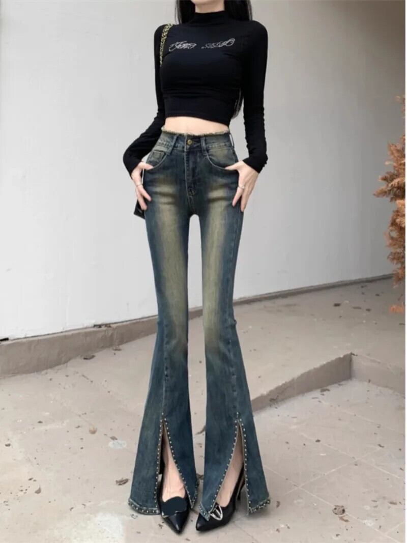 甘いホットガールリベットジーンズ秋/冬レトロフレアスリムフィットウエストパンツ レッド 大人ガーリー スウィート キュート カジュアル ウィンター 冬物