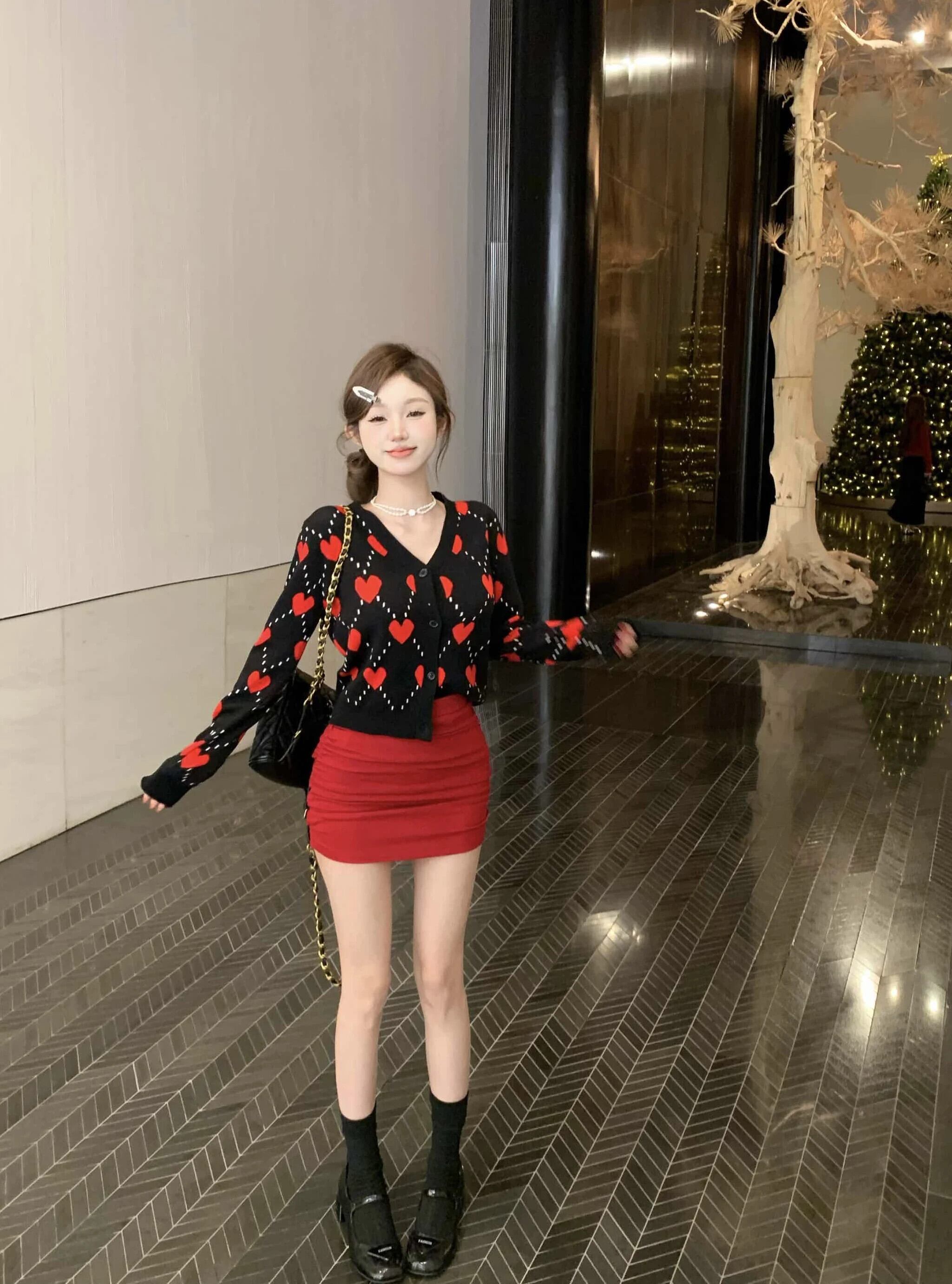 スイートガールスーツ秋/冬 V ネックラブセーター赤ラップヒップミニスカート 2 点セット レッド 大人ガーリー スウィート キュート カジュアル オータム 秋物 ウィンター 冬物 Vネック