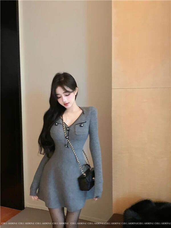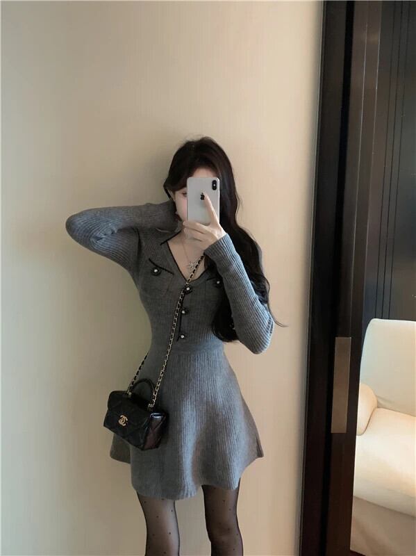 甘いホットガールグレー V ネックニットドレス冬スリムフィット長袖 A ラインショートドレス ロング 大人ガーリー スウィート キュート カジュアル ウィンター 冬物 Vネック Aライン