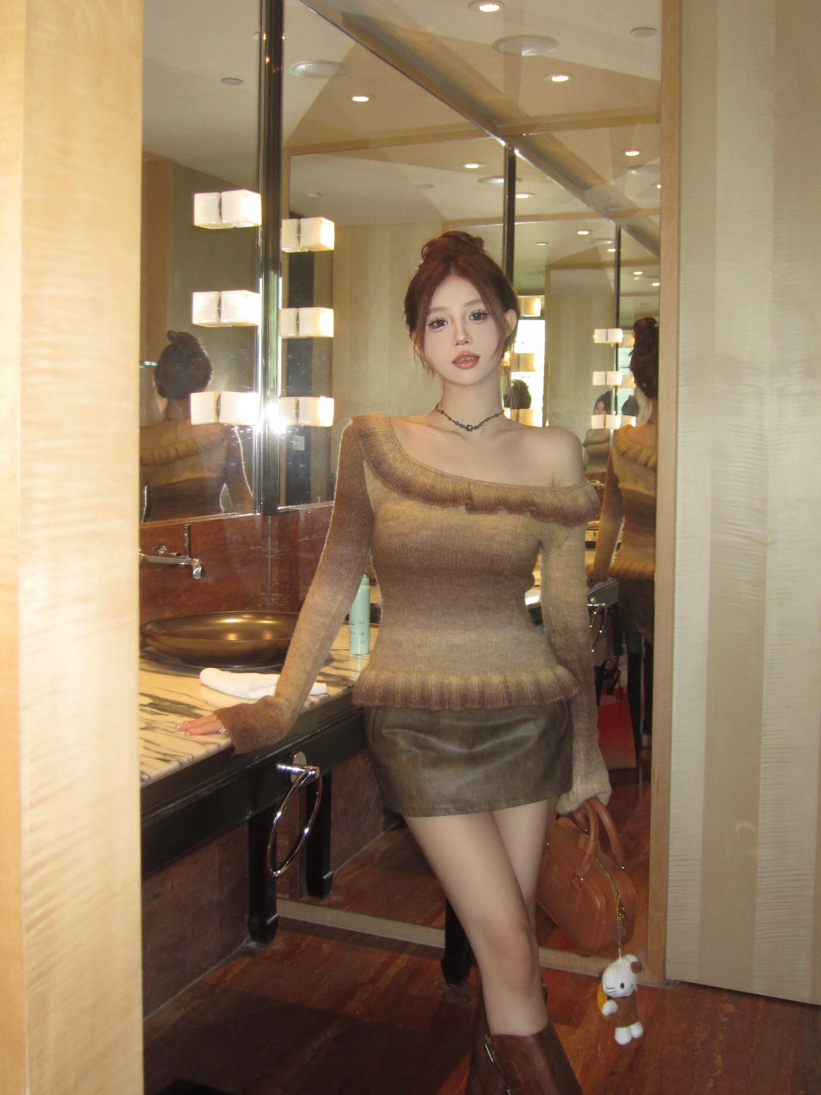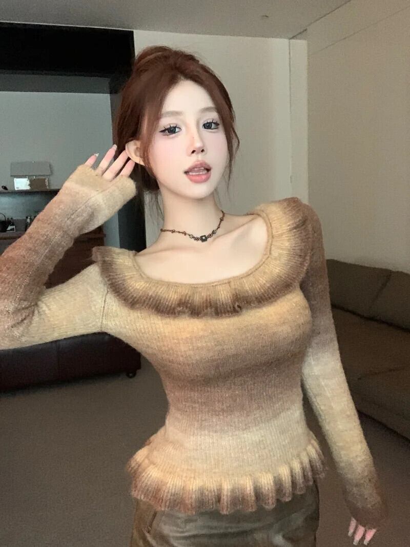 Sweet Girl グラデーションフリルスクエアカラーニットプルオーバー秋と冬長袖スリムフィットセーター ロング 大人ガーリー スウィート キュート カジュアル オータム 秋物 ウィンター 冬物 スクウェア