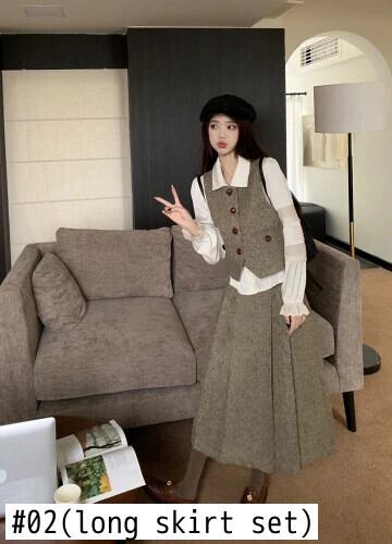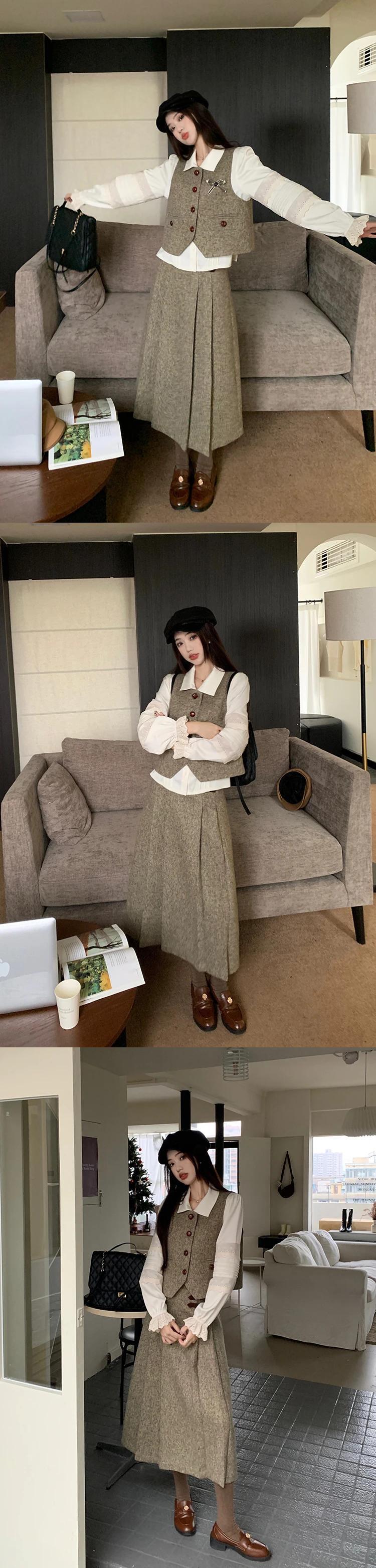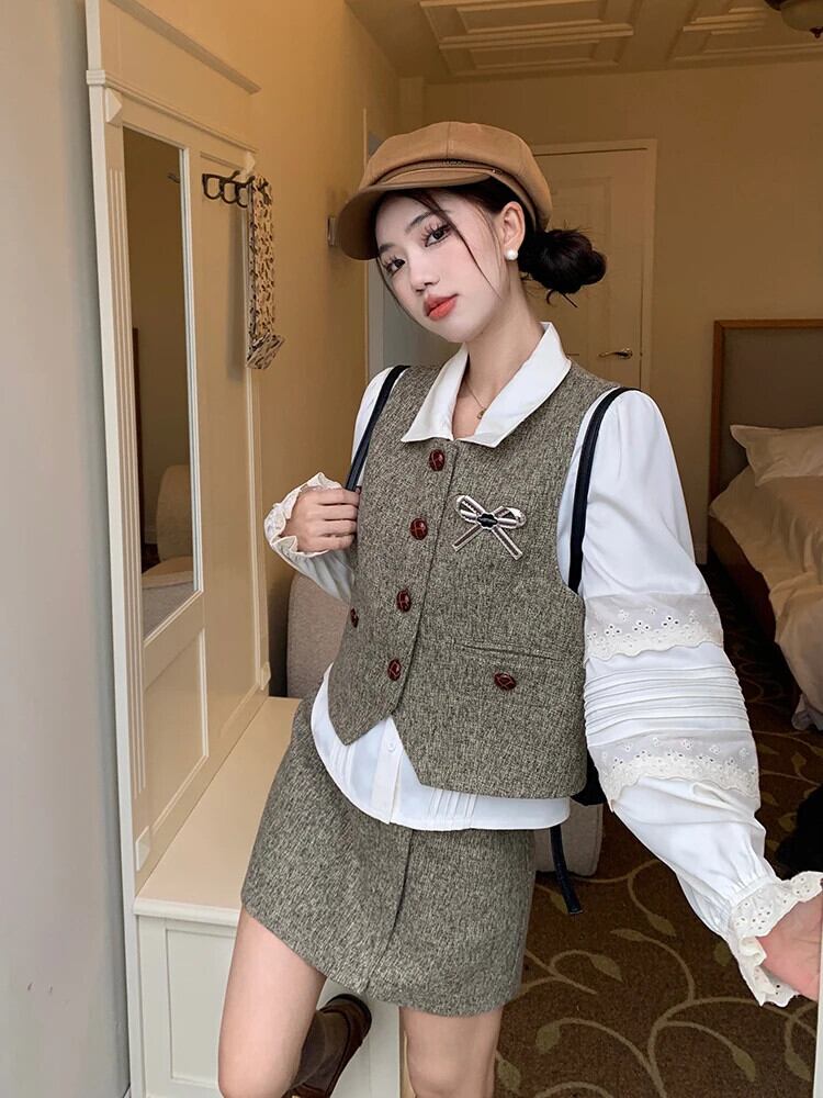 甘いホットガールスーツ冬ホワイトベースシャツウールベストジャケットウエストスカート 3 点セット 大人ガーリー スウィート キュート カジュアル ウィンター 冬物