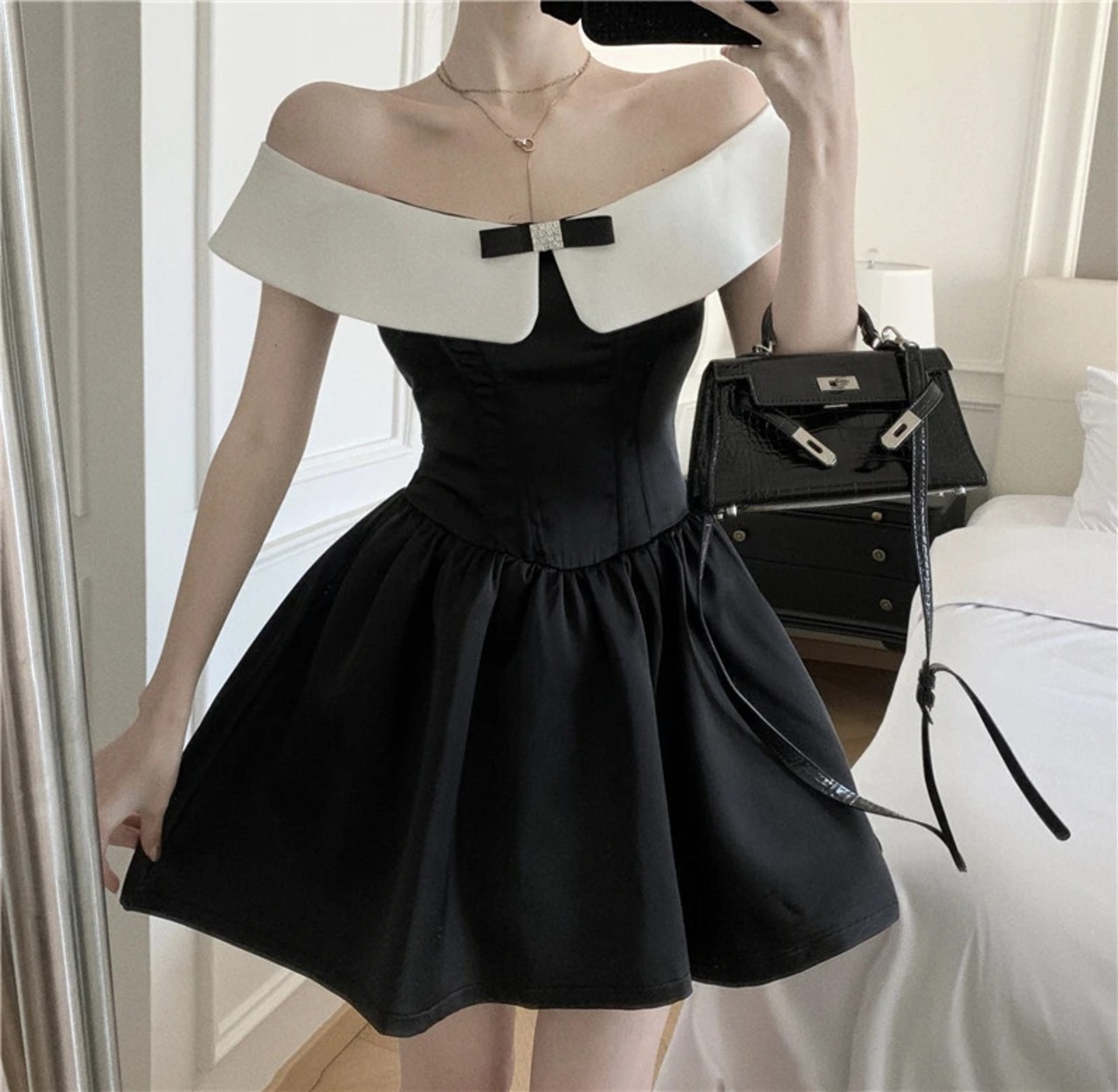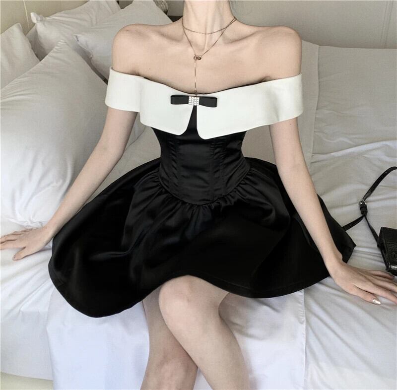 甘いホットガールスリムフィットオフショルダードレス春/夏スラッシュネックスリムフィット A ラインブラックドレス 大人ガーリー スウィート キュート カジュアル スプリング 春物 サマー 夏物 Aライン