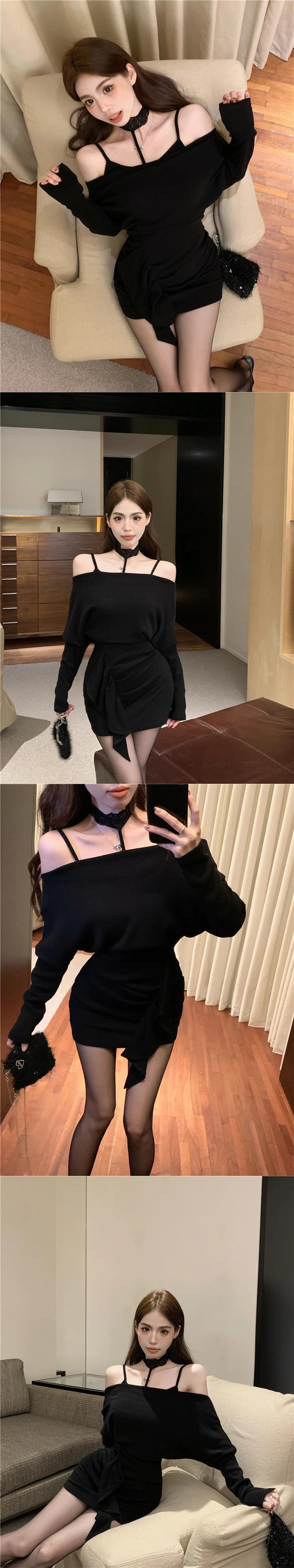 甘いホットガールレッドニットラップヒップドレス冬ソリッドカラー純粋セクシーオフショルダースリムフィットドレス 大人ガーリー スウィート キュート カジュアル ウィンター 冬物 ピュア