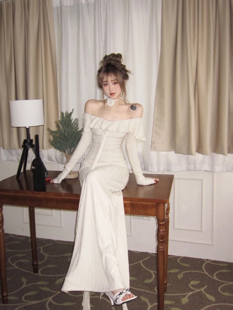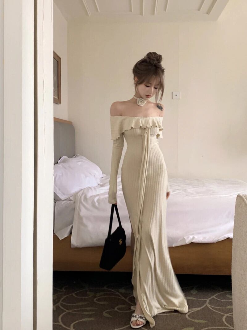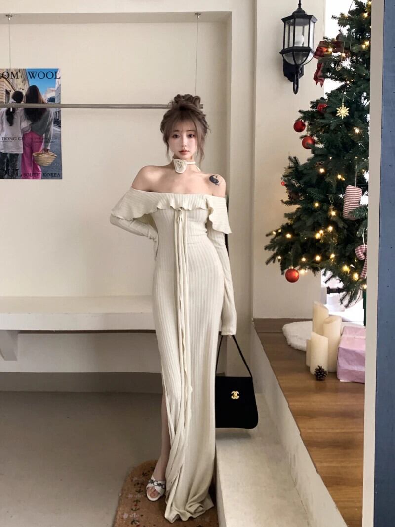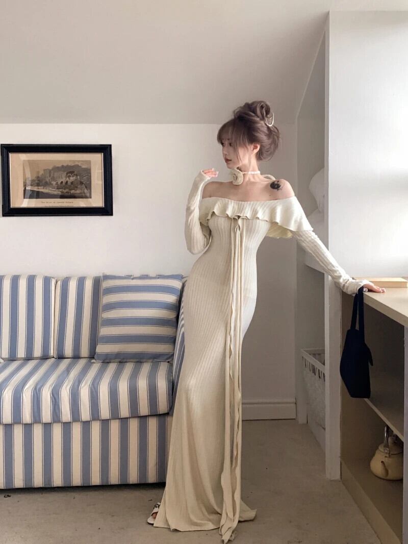 フレンチスイートホットガールフリルオフショルダードレス冬スリムフィット長袖ラップヒップドレス ロング 大人ガーリー スウィート キュート カジュアル ウィンター 冬物