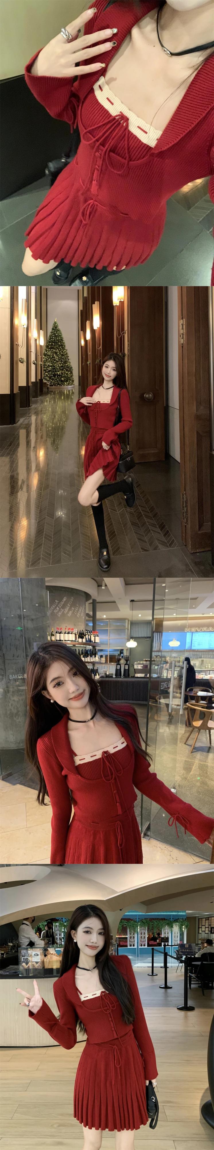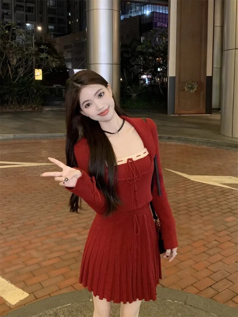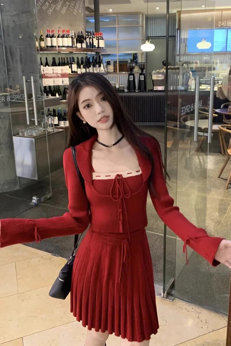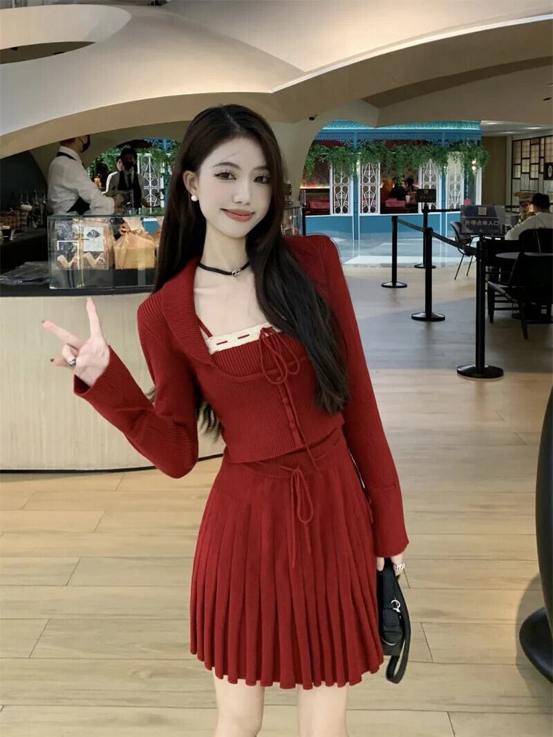 French Sweet Girl スーツ レディース 冬 レッド ニット カーディガン キャミソール Aライン ミニスカート 3点セット 大人ガーリー スウィート キュート カジュアル ウィンター 冬物