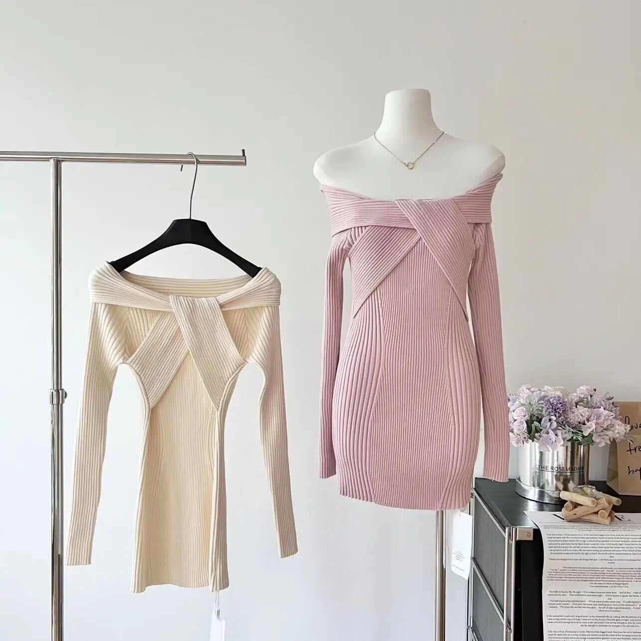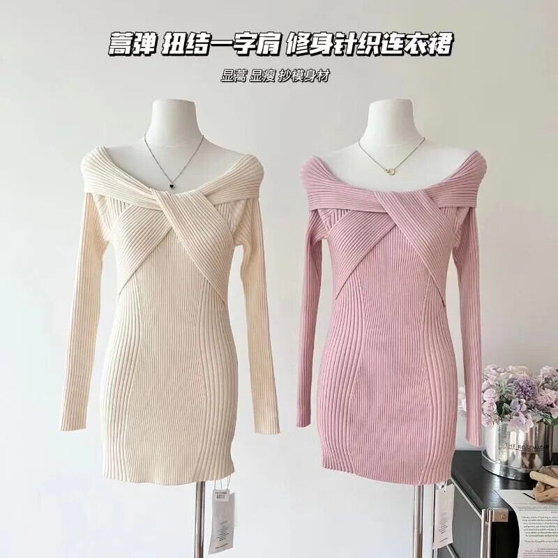 甘いホットガールニットドレス秋と冬スリムフィットツイストオフショルダー長袖ドレス ロング 大人ガーリー スウィート キュート カジュアル オータム 秋物 ウィンター 冬物
