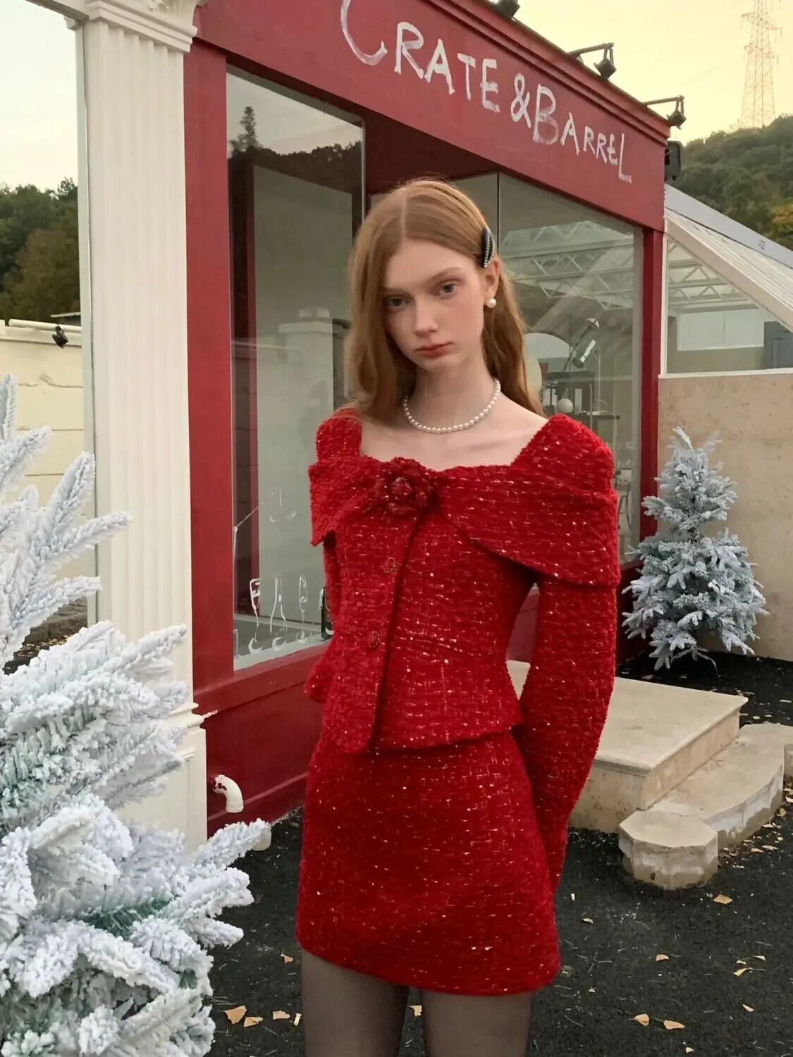 ホットガールクリスマススーツ冬スクエアネック厚いツイードコートウエストミニスカートツーピースセット ウィンター 冬物 スクウェア