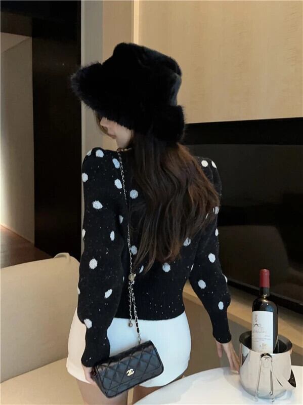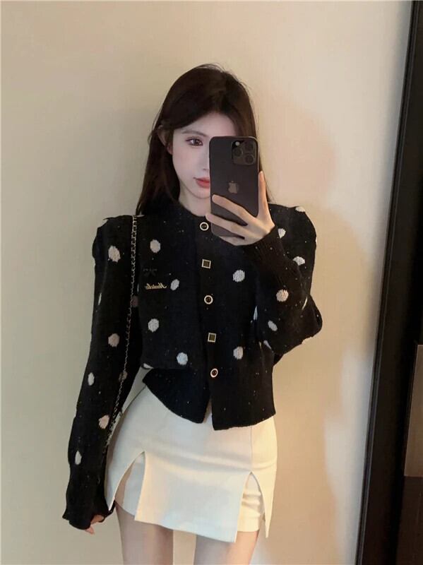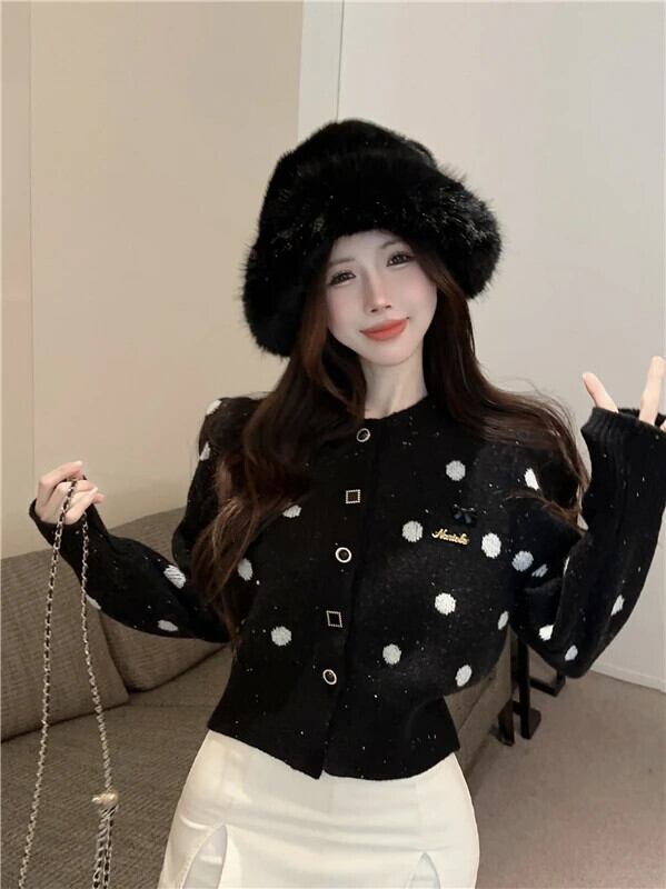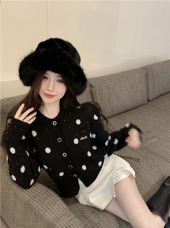 Sweet Girl 水玉模様シングルブレストセーター冬 O ネック長袖ショートニットカーディガン ロング 大人ガーリー スウィート キュート カジュアル ウィンター 冬物 Oネック