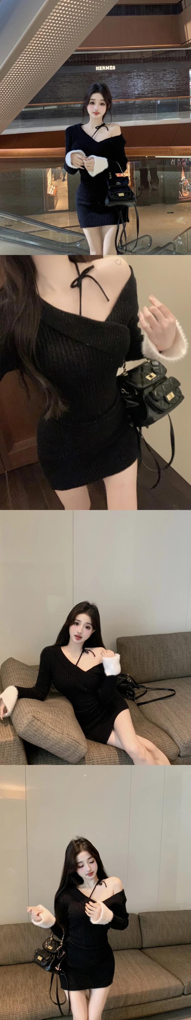 甘いホットガールガール長袖 V ネックオフショルダードレス冬ラップヒップセーターショートドレス ロング 大人ガーリー スウィート キュート カジュアル ウィンター 冬物 Vネック