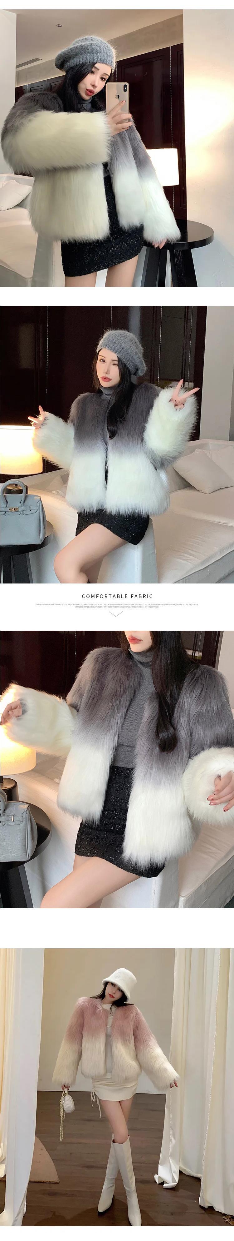 甘いホットガールグラデーションフェイクファーコート長袖ラウンドネックルーズショートカーディガンコート ロング 大人ガーリー スウィート キュート カジュアル Oネック