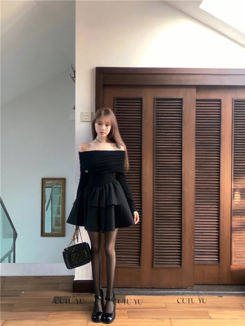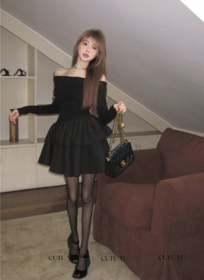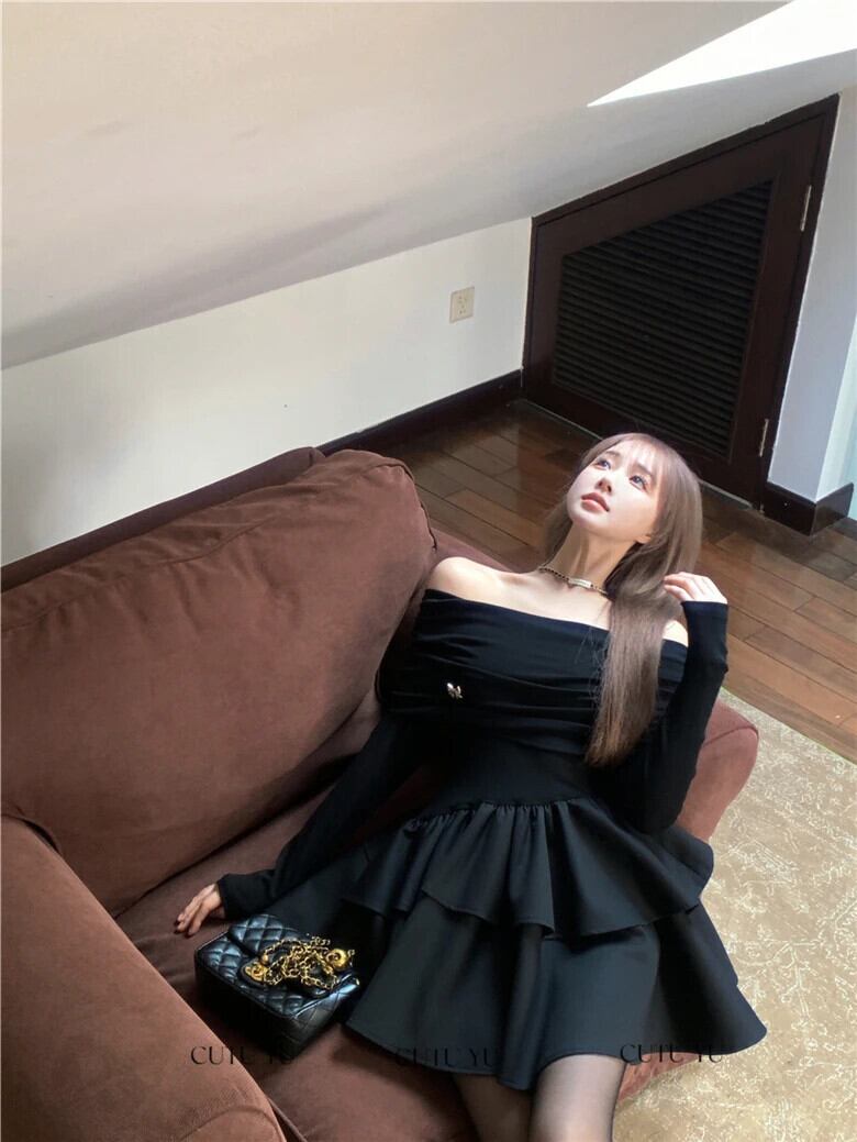 甘いホットガールレトロセクシー黒オフショルダードレス秋/冬ニットパッチワーク長袖ケーキふわふわドレス ロング ブラック 大人ガーリー スウィート キュート カジュアル オータム 秋物 ウィンター 冬物