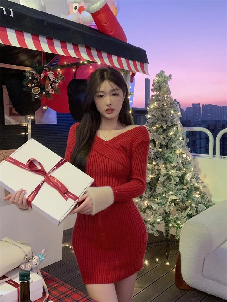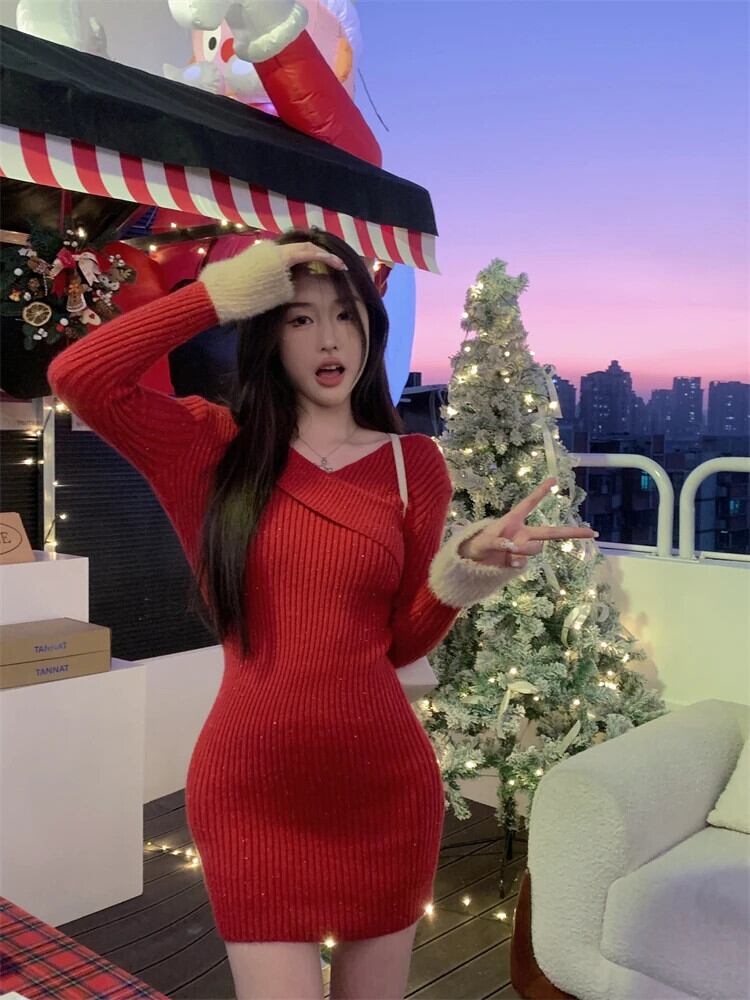 甘いホットガールオフショルダーニットドレス冬 V ネックスリム長袖ヒップラップショートドレス ロング 大人ガーリー スウィート キュート カジュアル ウィンター 冬物 Vネック