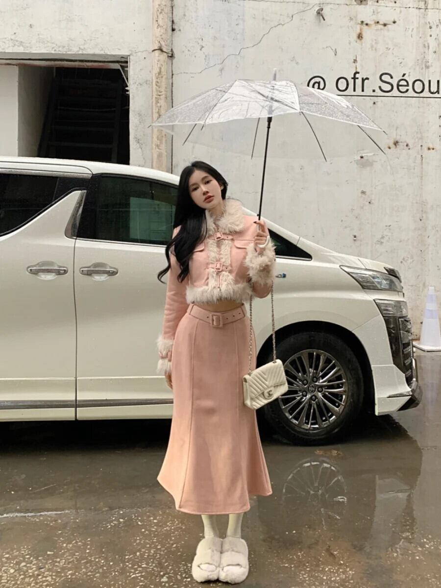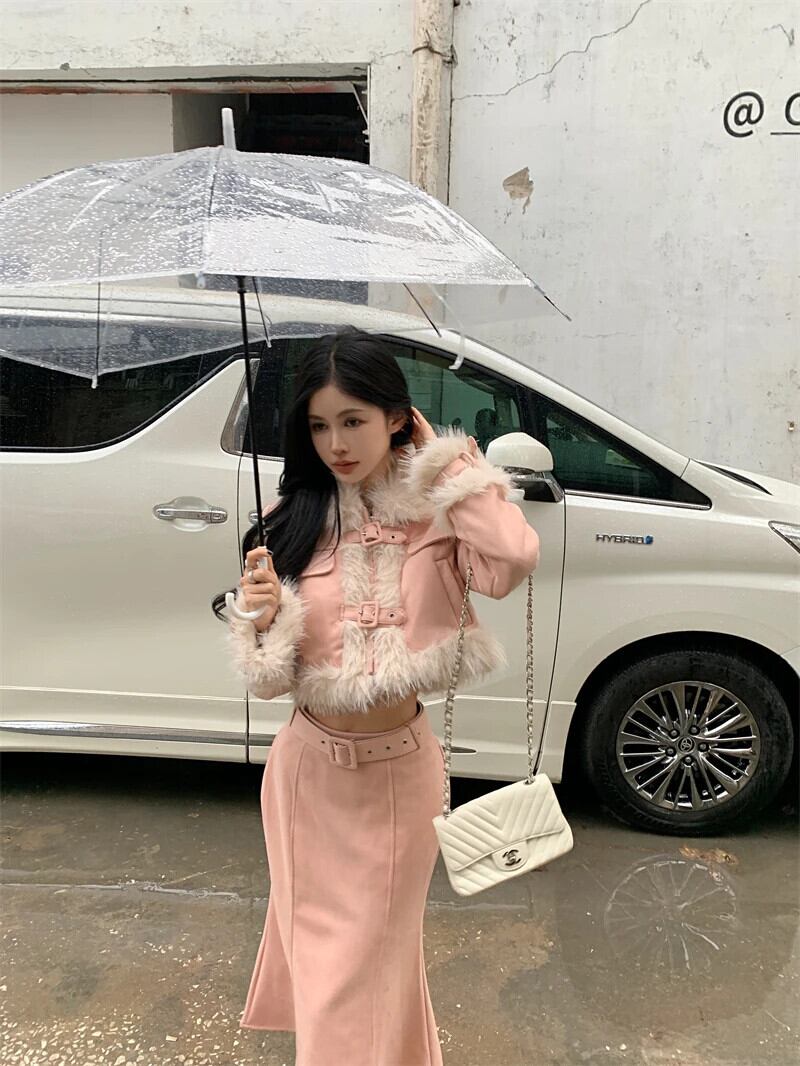 甘いホットガールスーツ春毛皮ターンダウン襟ジャケットウエストマーメイドスカート 2 点セット 大人ガーリー スウィート キュート カジュアル スプリング 春物