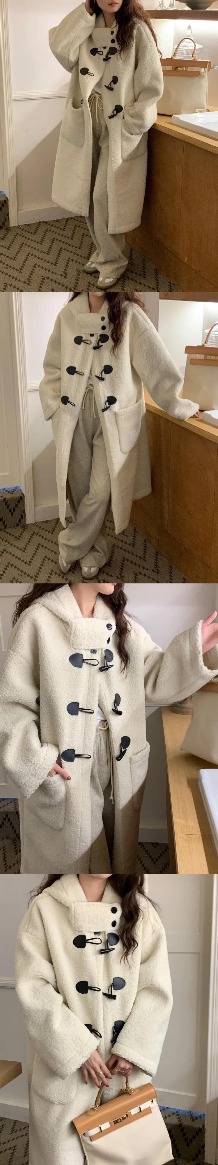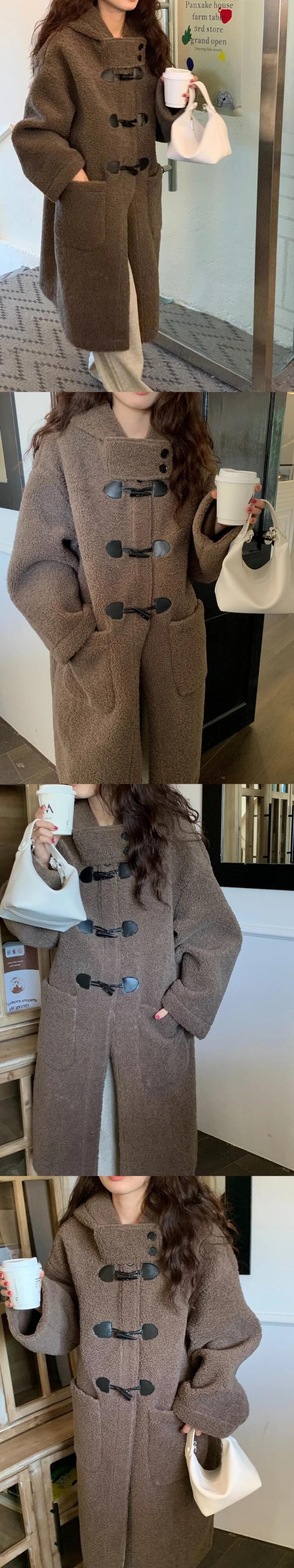 甘いホットガールスタンドカラーホーンボタンコート秋/冬ラムウールルーズフード付きミッドレングスコート 大人ガーリー スウィート キュート カジュアル オータム 秋物 ウィンター 冬物