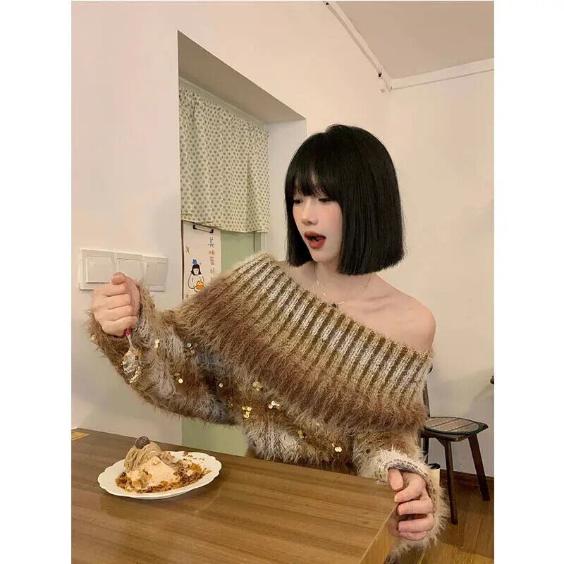甘いホットガールオフショルダースパンコールセーター秋/冬スラッシュネックセクシーニットプルオーバー 大人ガーリー スウィート キュート カジュアル オータム 秋物 ウィンター 冬物