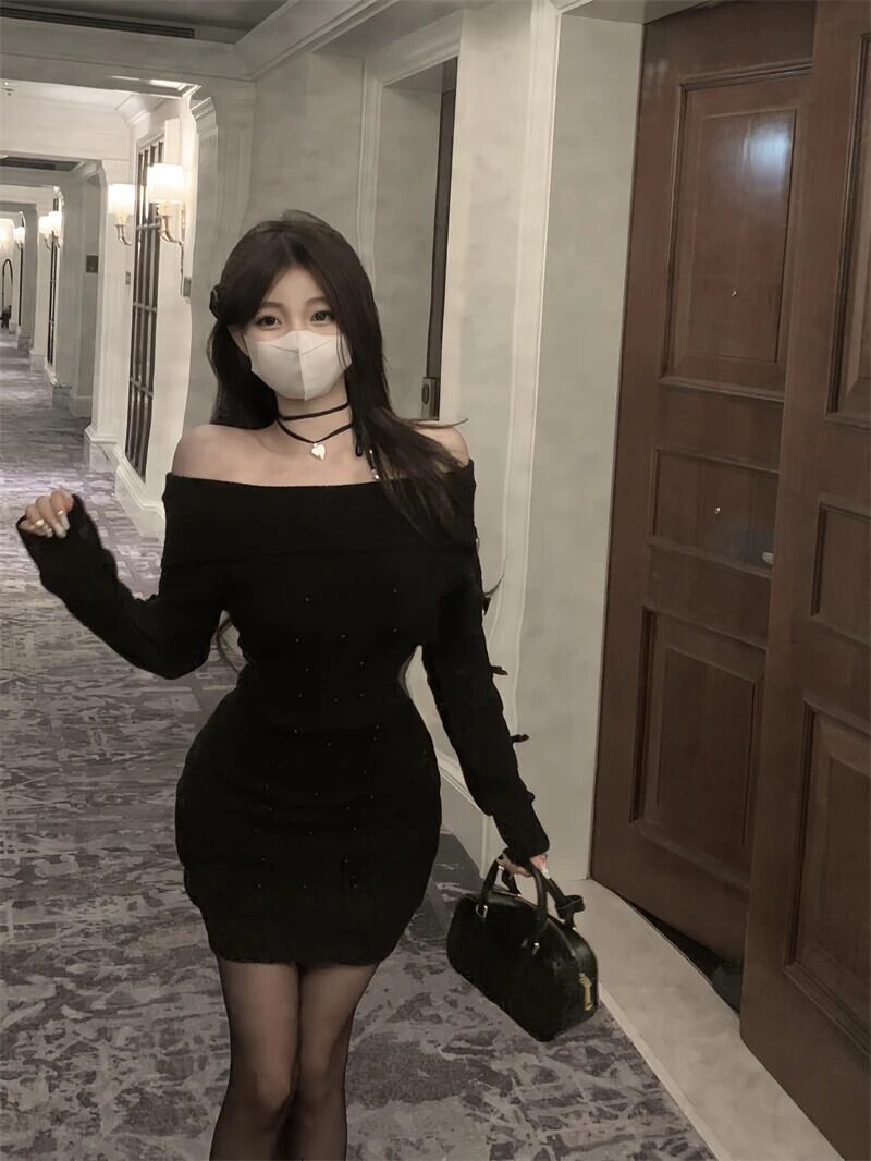 甘いホットガールビーズオフショルダーヒップラップドレス秋/冬純粋セクシースリムフィットニットショートドレス 大人ガーリー スウィート キュート カジュアル オータム 秋物 ウィンター 冬物 ピュア