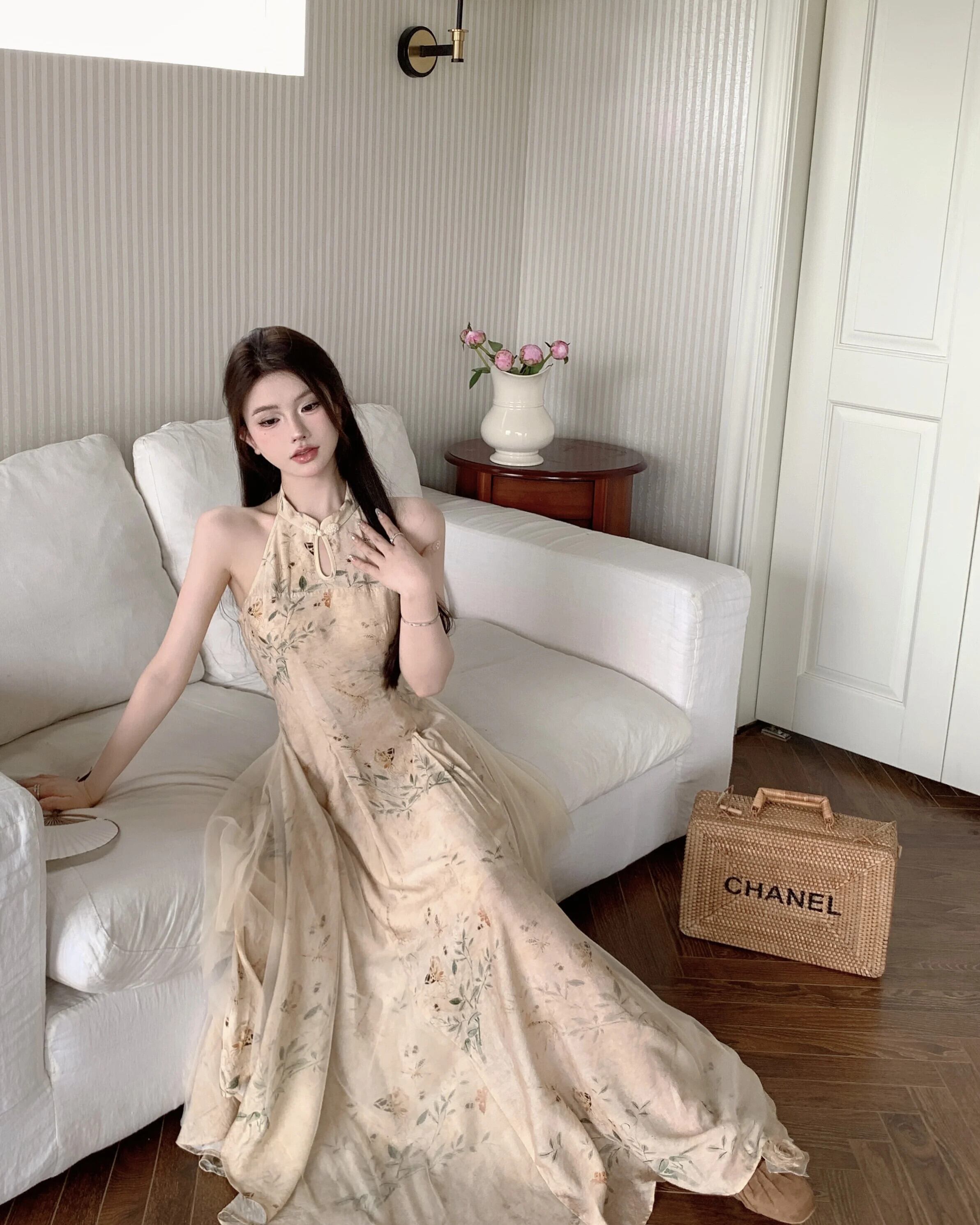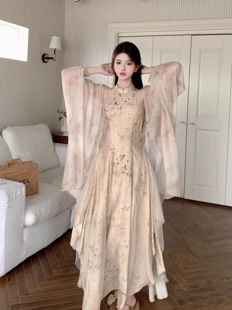 甘いホットガール中国スーツ冬メッシュパッチワークチャイナドレスプリントカーディガンツーピースセット 大人ガーリー スウィート キュート カジュアル ウィンター 冬物