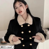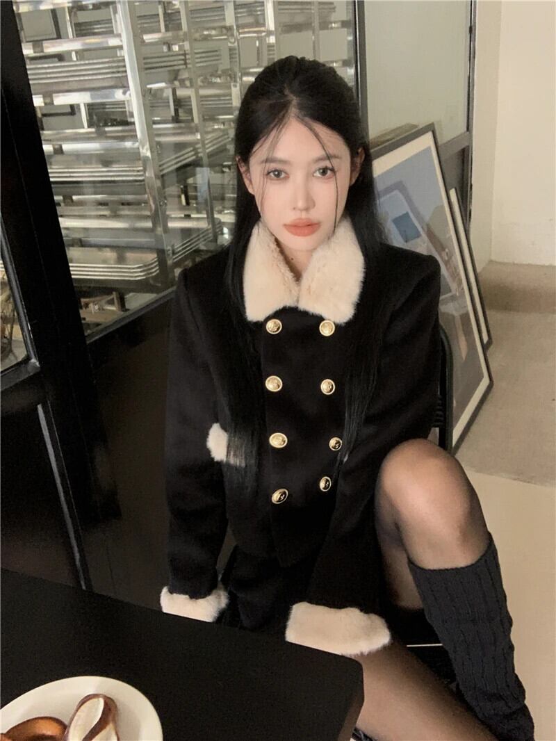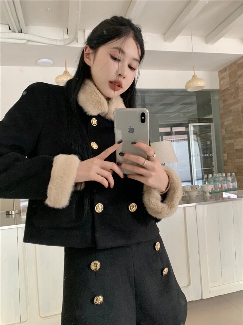 甘いホットガールスーツ冬厚い毛皮襟ダブルブレストジャケットストレートチューブルーズショーツ 2 点セット 大人ガーリー スウィート キュート カジュアル ウィンター 冬物 ブルマー