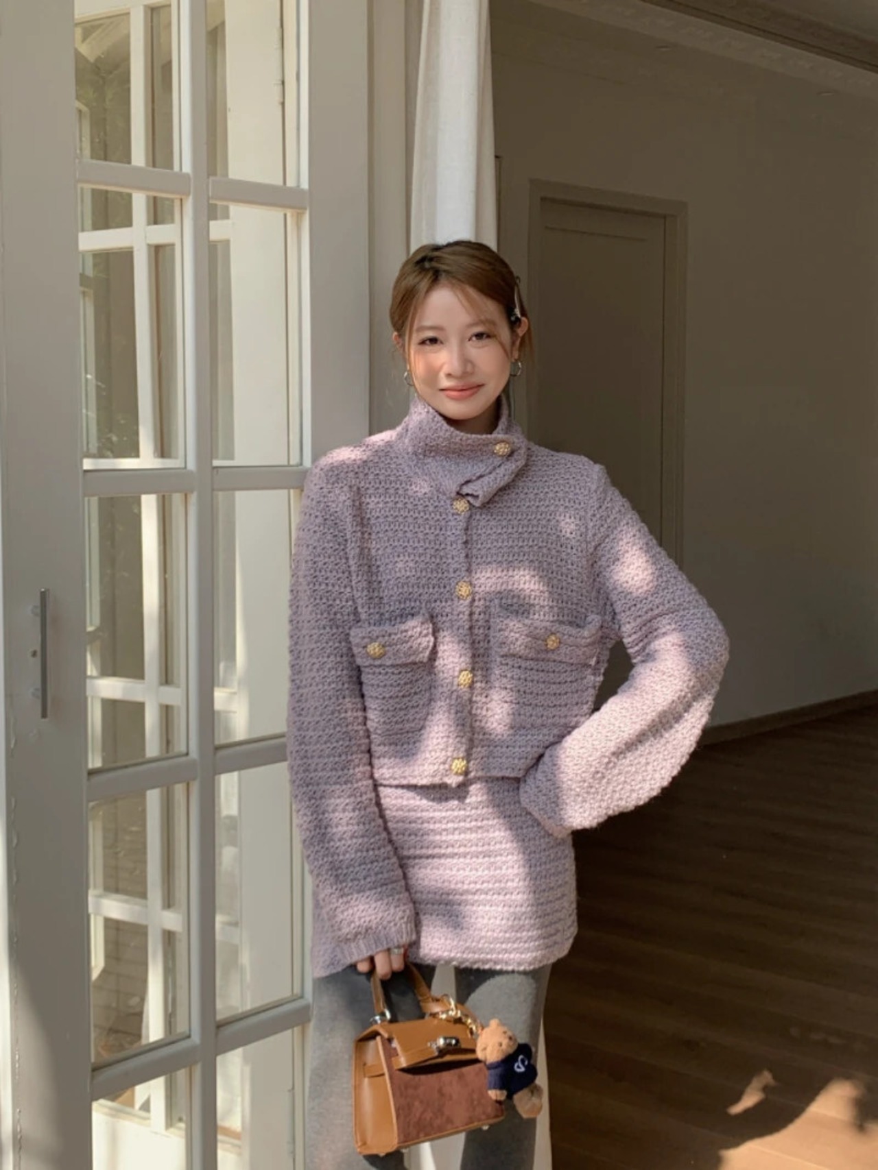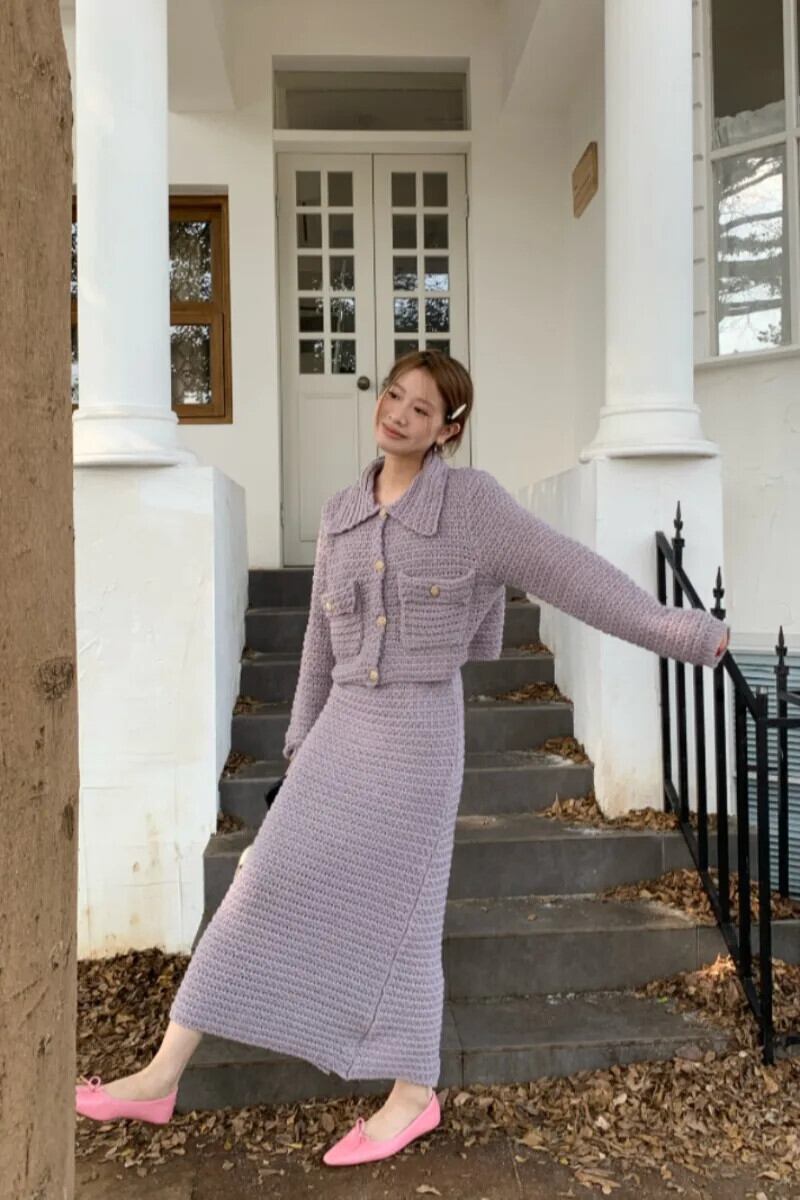 甘いホットガールスーツ冬タートルネックショートニットカーディガンウエスト A ラインロングスカート 2 点セット 大人ガーリー スウィート キュート カジュアル ウィンター 冬物 Aライン