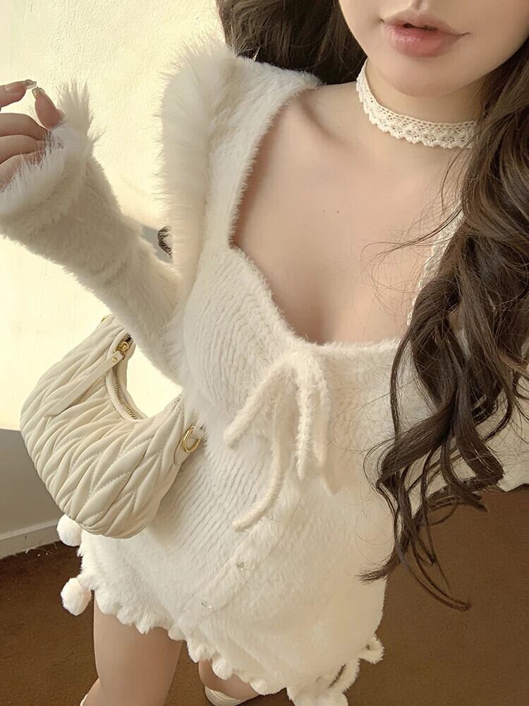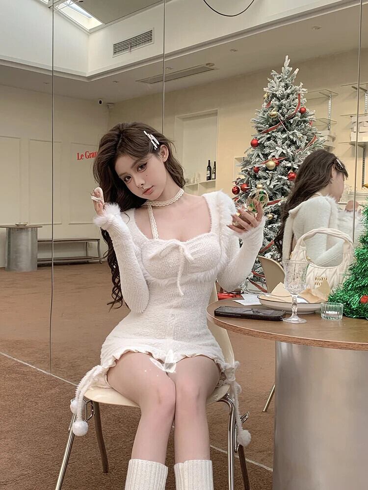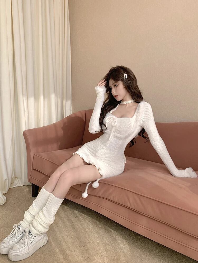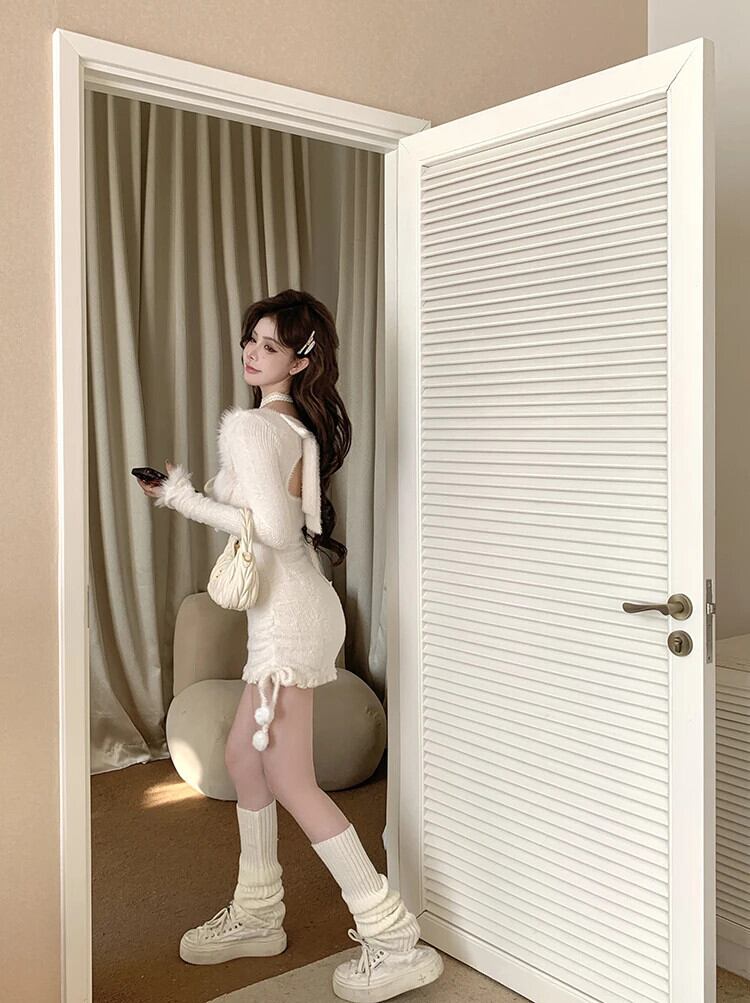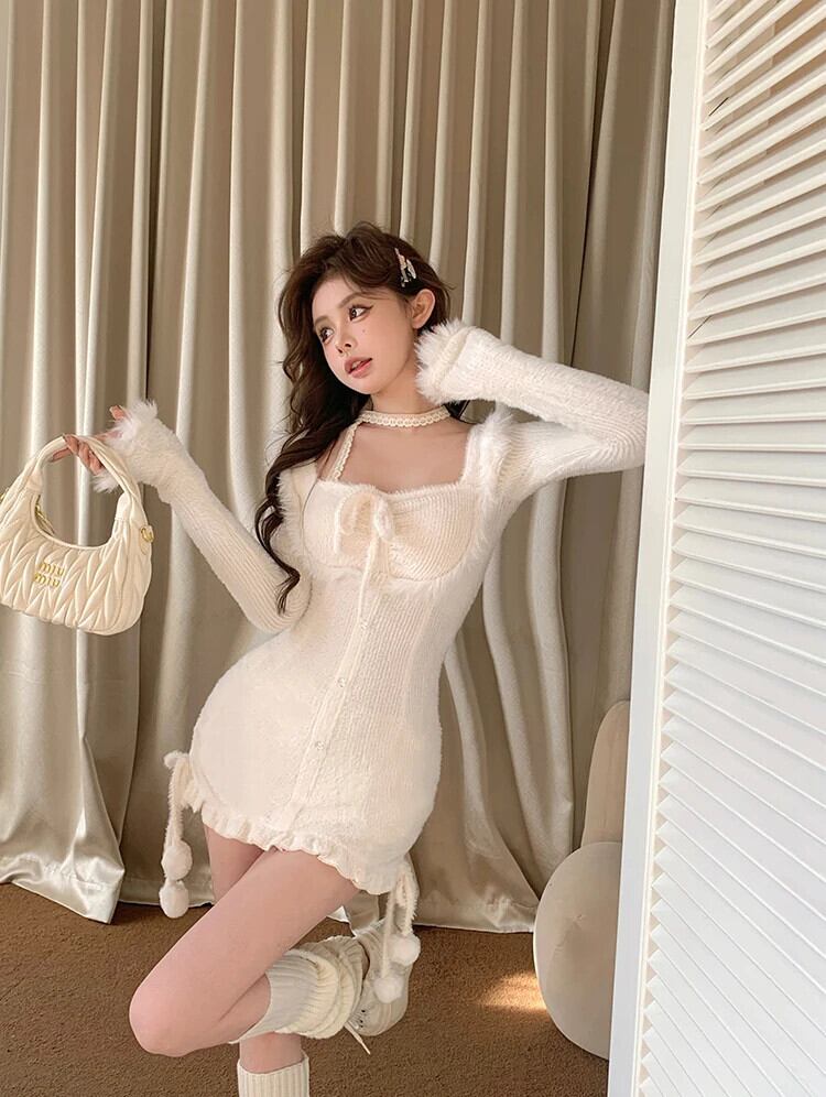 甘いホットガール長袖ニットドレス春スクエアカラーレースアップ長袖ショートドレス ロング 大人ガーリー スウィート キュート カジュアル スプリング 春物 スクウェア