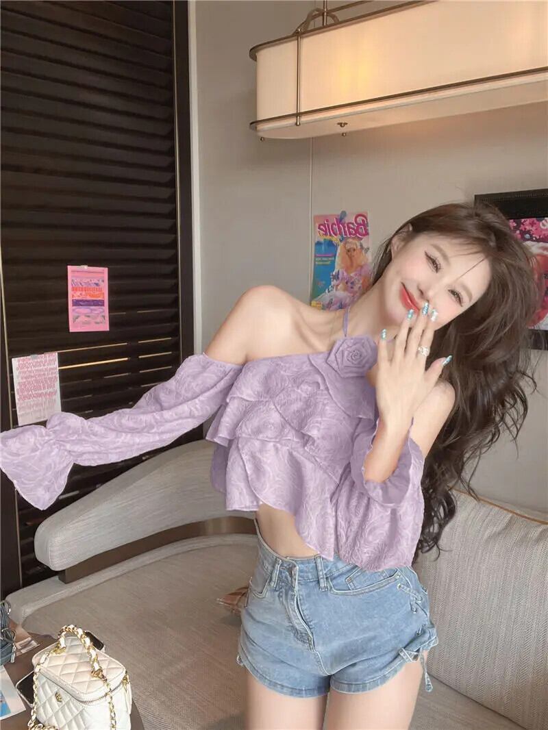甘いホットガールピンクホルターネックシャツ春セクシー立体フラワーオフショルダーフレアスリーブフリルショートトップ レッド 大人ガーリー スウィート キュート カジュアル スプリング 春物 フラワーデザイン