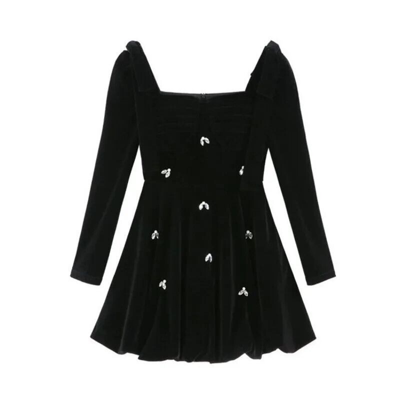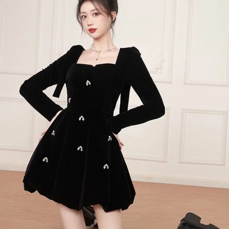 フレンチスイートホットガールスクエアカラードレス秋/冬スリムフィットベルベットレトロAラインブラックドレス 大人ガーリー スウィート キュート カジュアル オータム 秋物 ウィンター 冬物 スクウェア