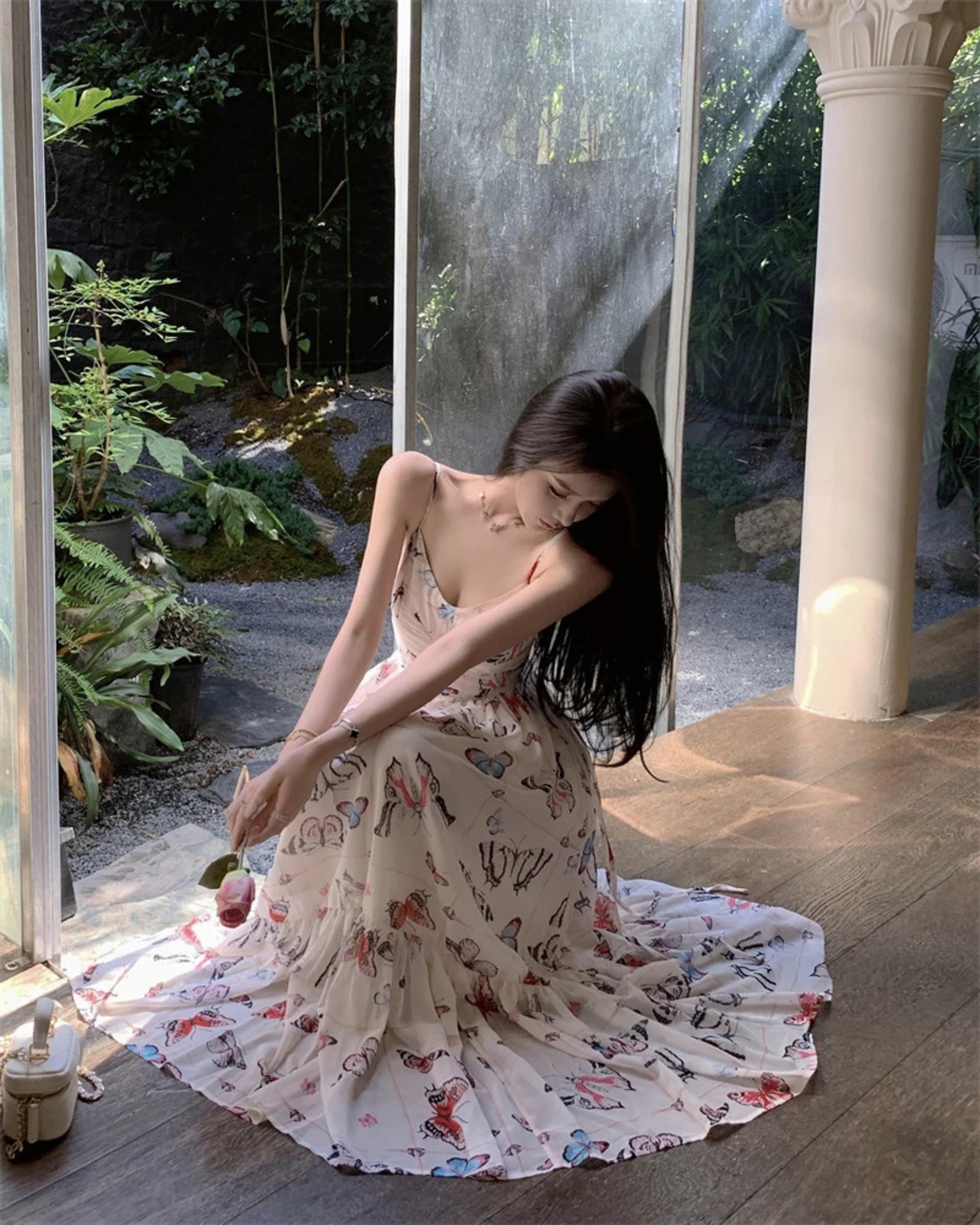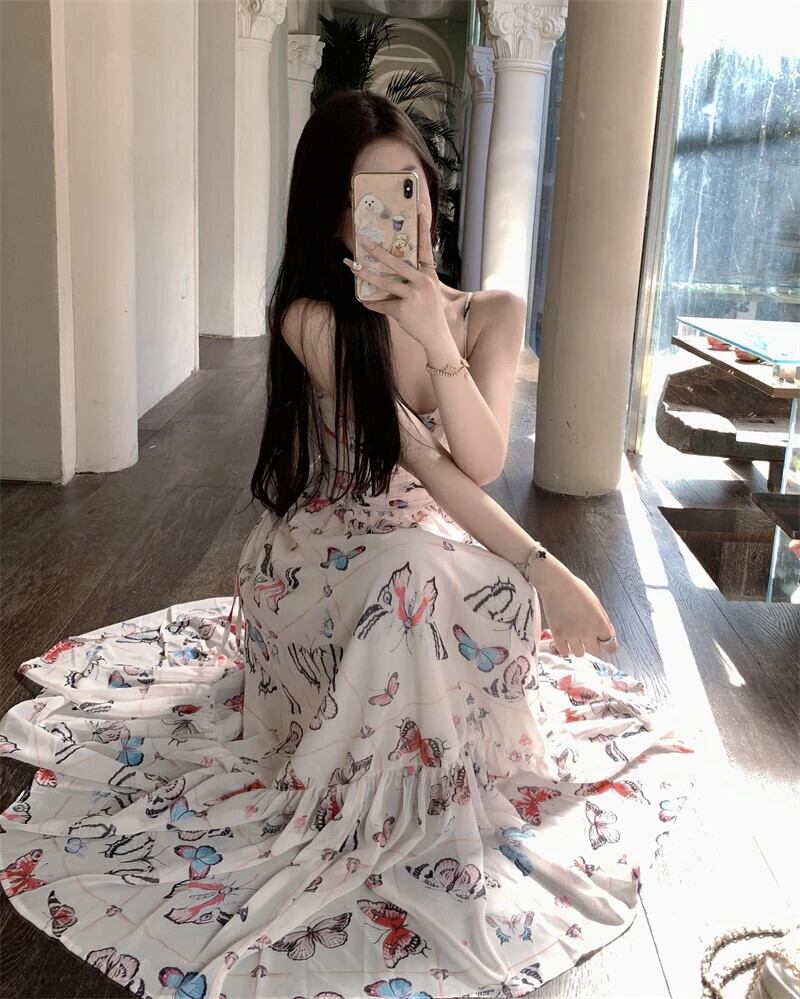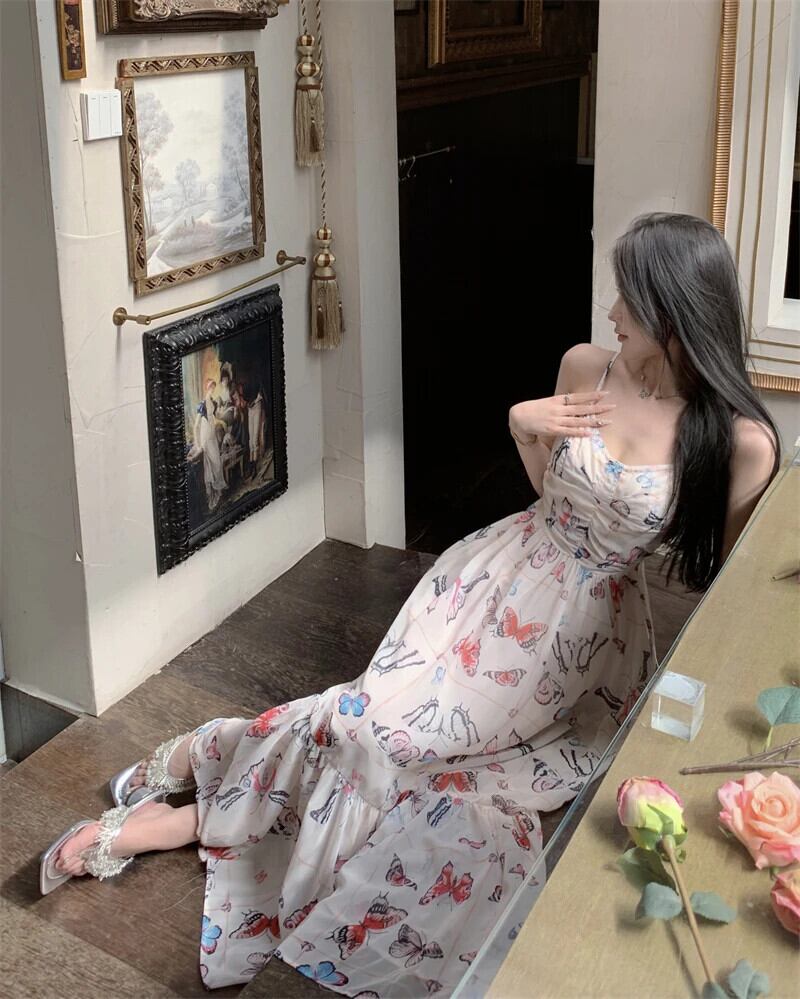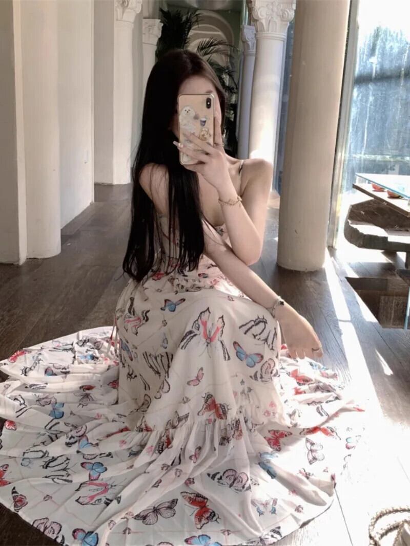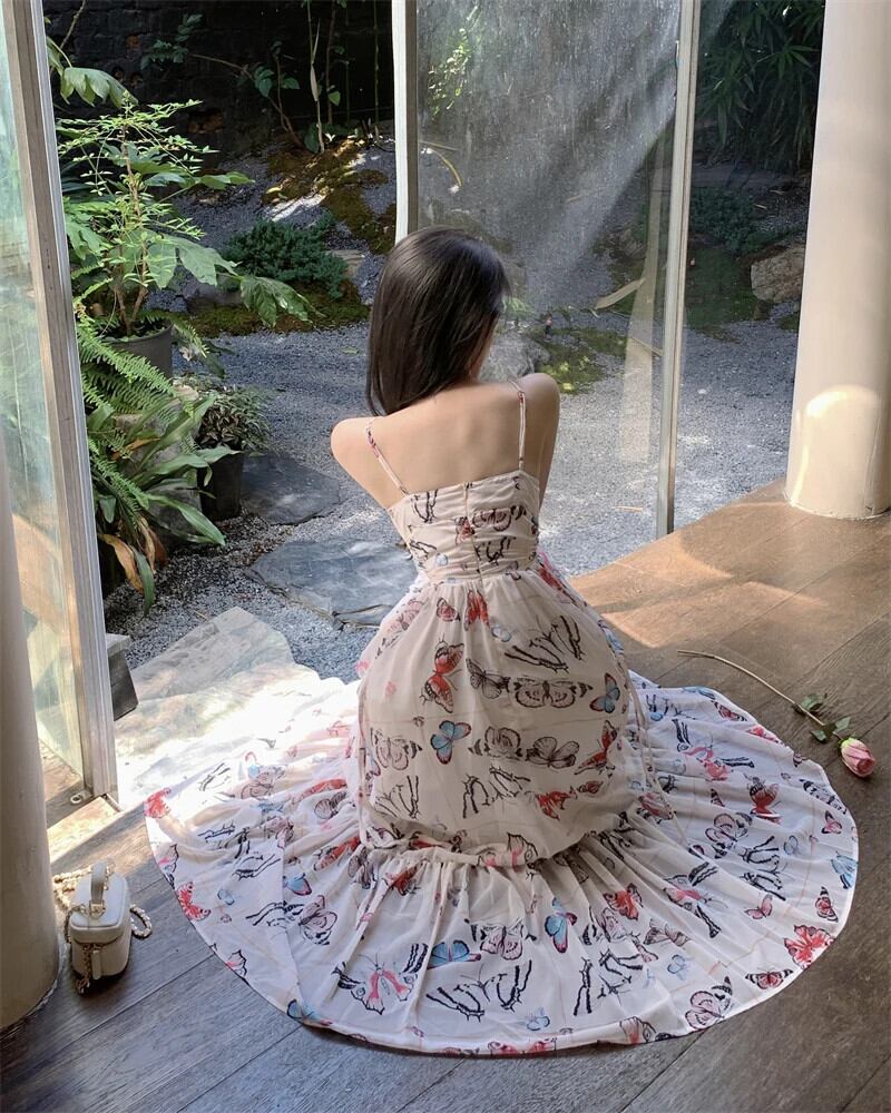 甘いホットガールバタフライプリントドレス春夏レースアップスリム A ラインストラップロングドレス 大人ガーリー スウィート キュート カジュアル スプリング 春物 サマー 夏物 Aライン