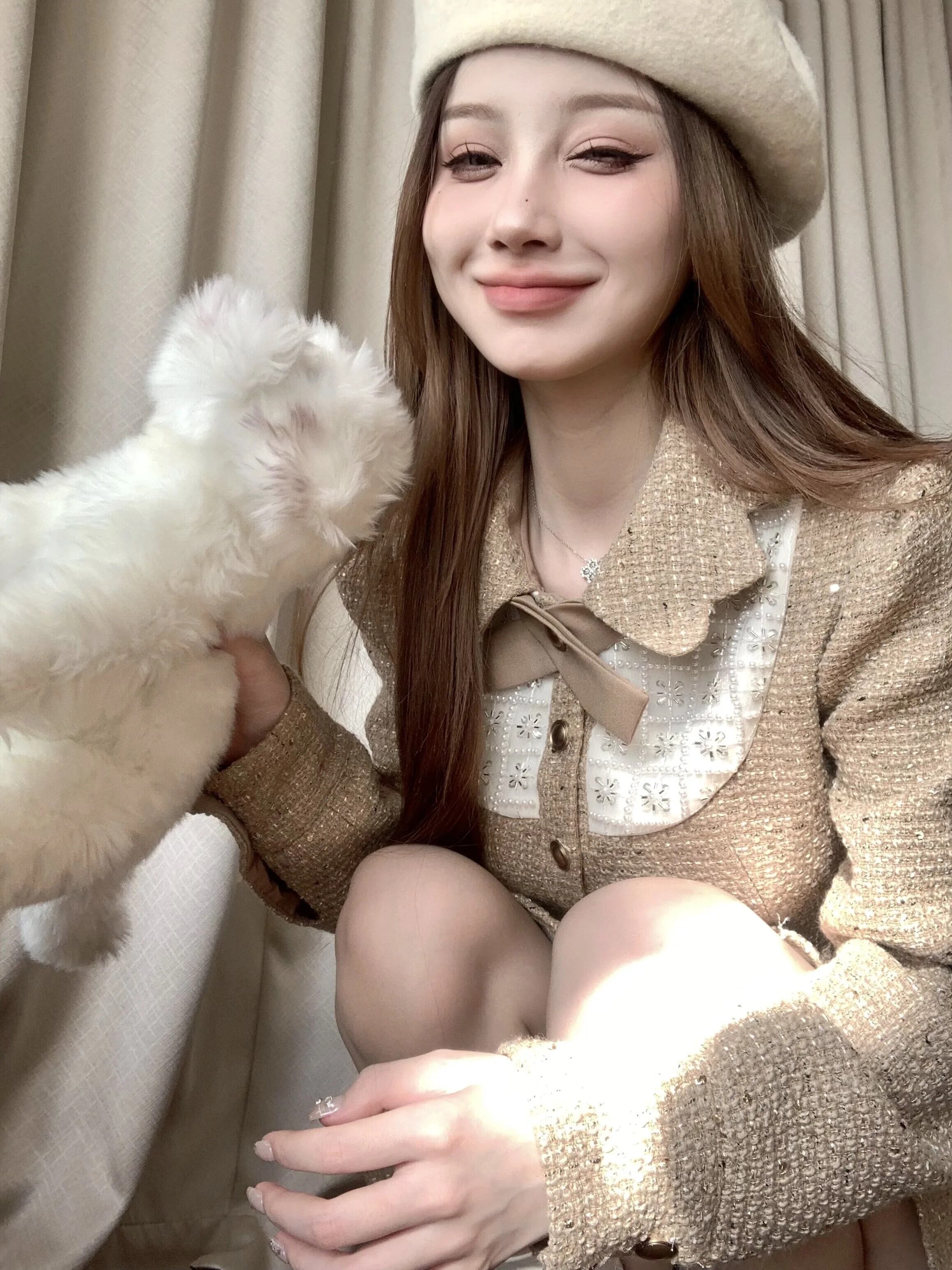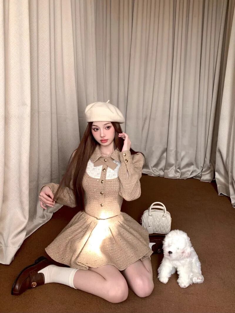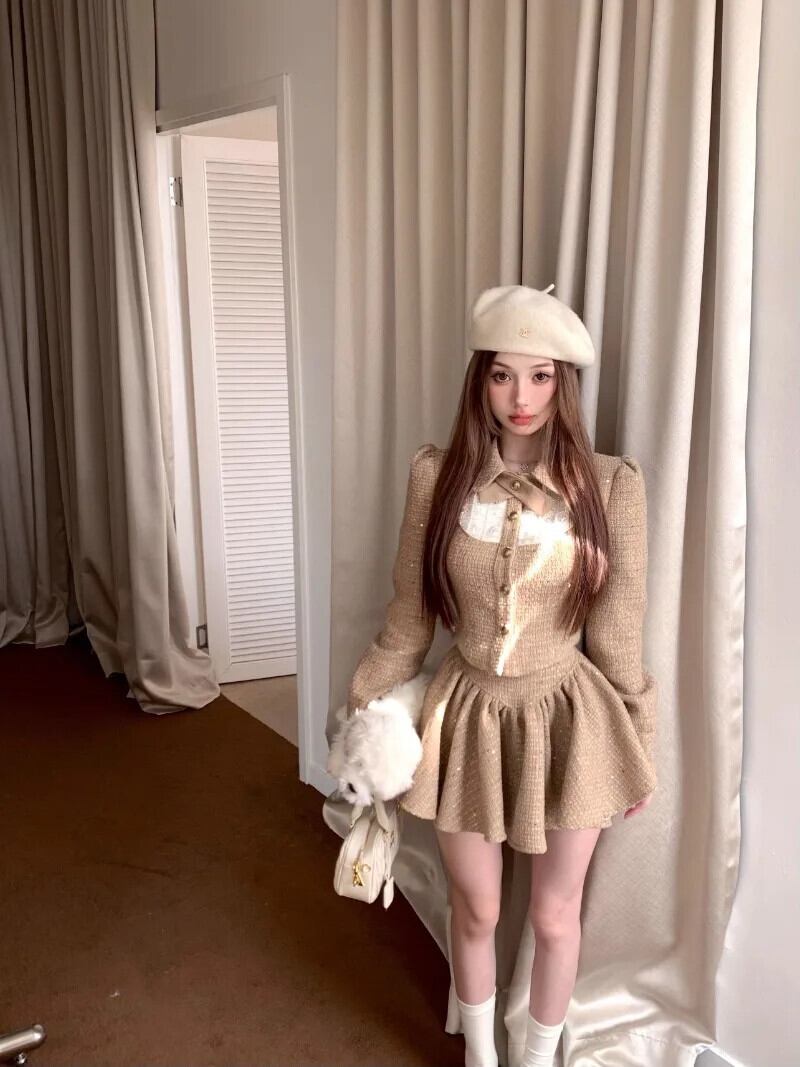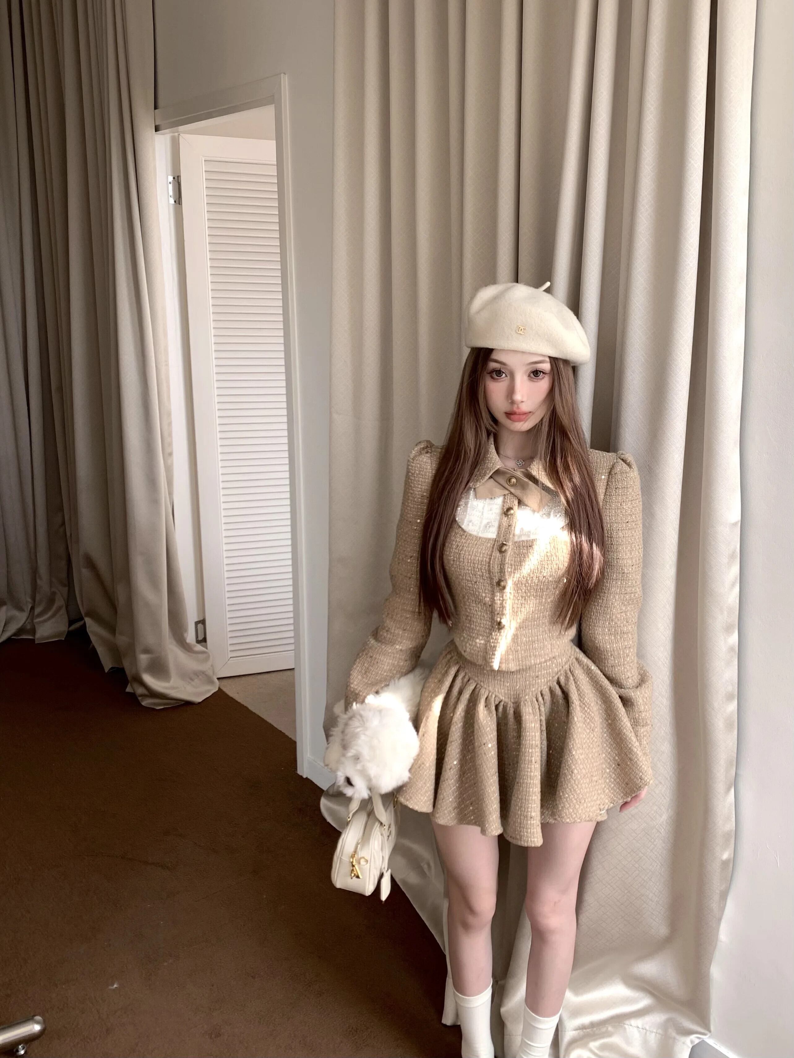 甘いホットガールスーツ冬ターンダウン襟ツイードジャケットウエスト A ラインミニスカート 2 点セット 大人ガーリー スウィート キュート カジュアル ウィンター 冬物 Aライン