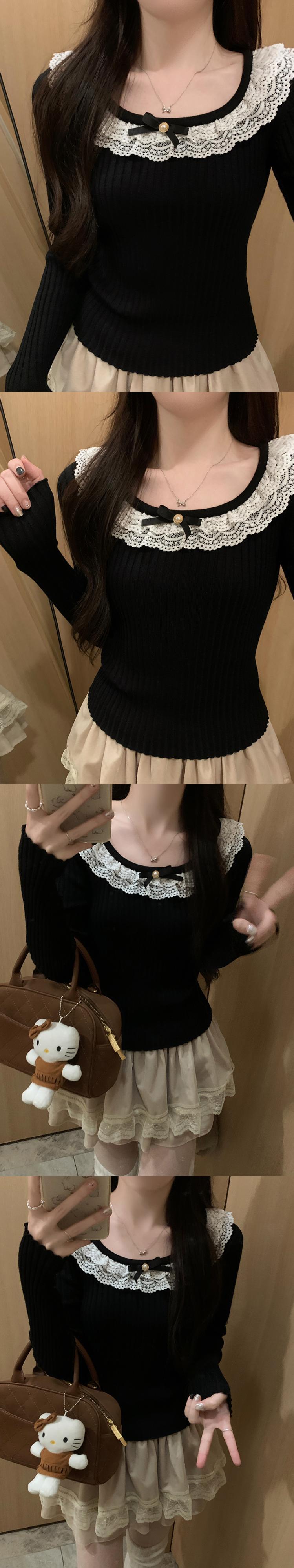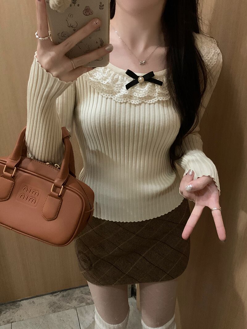 甘いホットガールレースリボンパッチワークスクエアカラーセーター冬スリムフィットボトムニットプルオーバー 大人ガーリー スウィート キュート カジュアル ウィンター 冬物 スクウェア