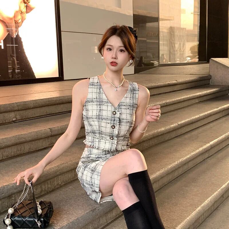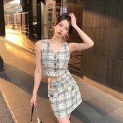 甘いホットガールスーツ春/秋チェック柄ノースリーブベストウエストヒップラップショートスカートツーピースセット 大人ガーリー スウィート キュート カジュアル スプリング 春物 オータム 秋物