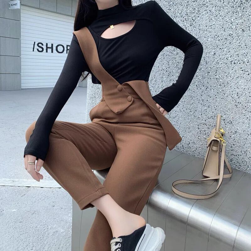 フレンチホットガールスーツ秋スタンドカラーニット長袖シャツジャンプスーツパンツツーピースセット ロング オータム 秋物