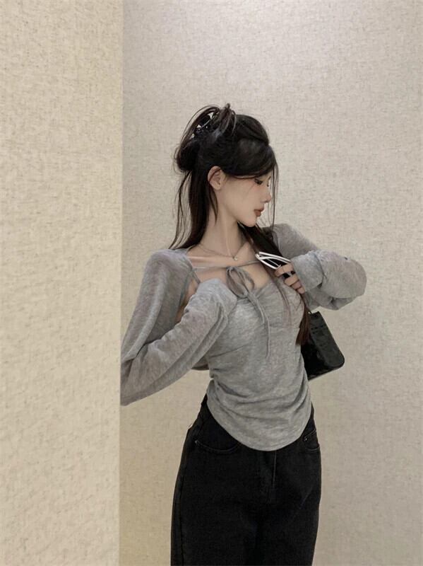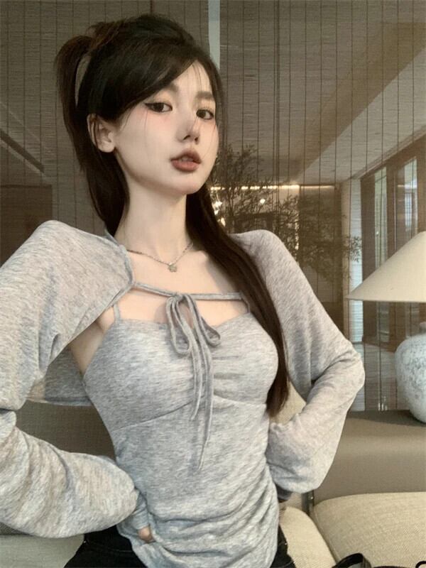 甘いホットガールグレースーツ春キャミソールタンクトップレースアップ長袖カーディガン Tシャツ 2 点セット ロング 大人ガーリー スウィート キュート カジュアル スプリング 春物
