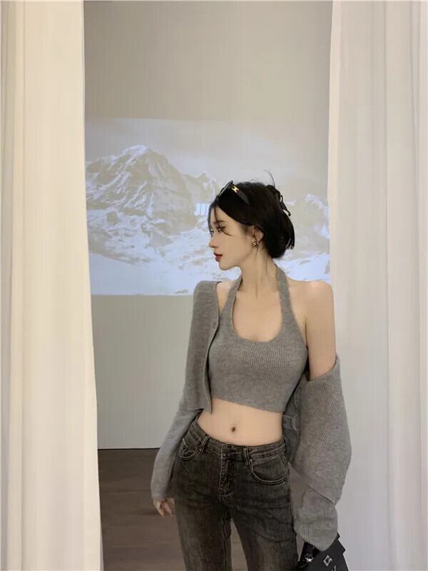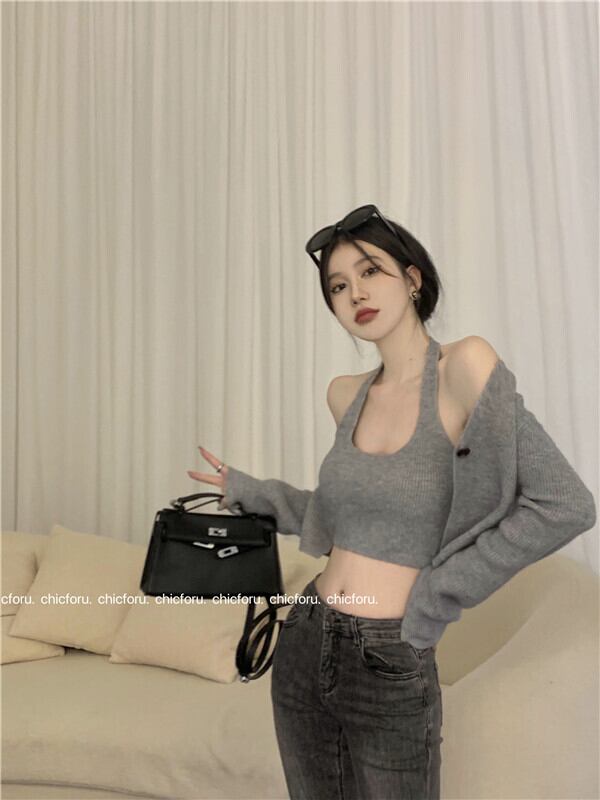 甘いホットガールスーツ冬長袖ニットカーディガンジャケットショートホルターネックキャミソールツーピースセット ロング 大人ガーリー スウィート キュート カジュアル ウィンター 冬物