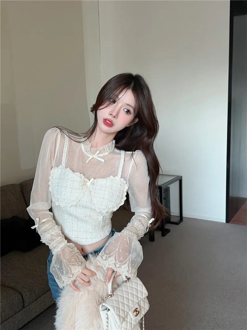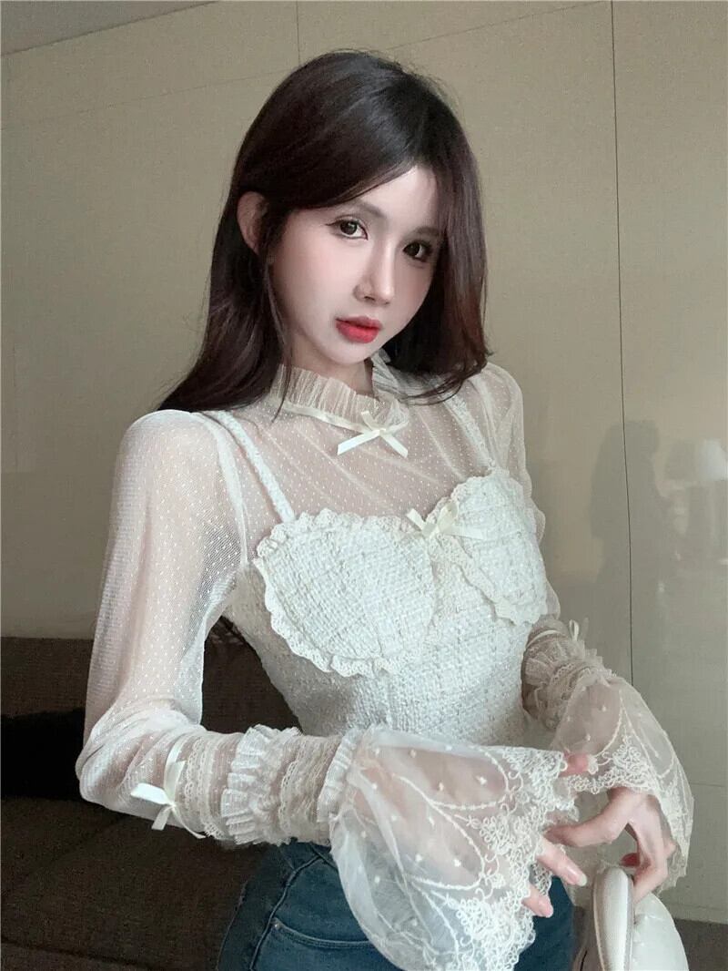 フレンチスウィートガールレースパッチワークボトムシャツ秋と冬フェイクツーピースショートトップ 大人ガーリー キュート カジュアル オータム 秋物 ウィンター 冬物