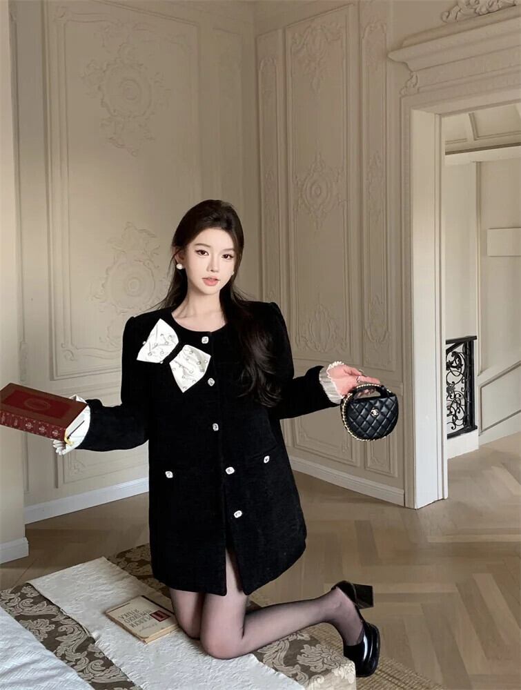 甘いホットガールダイヤモンドリボンコットンウールジャケット冬 O ネックシングルブレストカーディガン 大人ガーリー スウィート キュート カジュアル ウィンター 冬物 Oネック