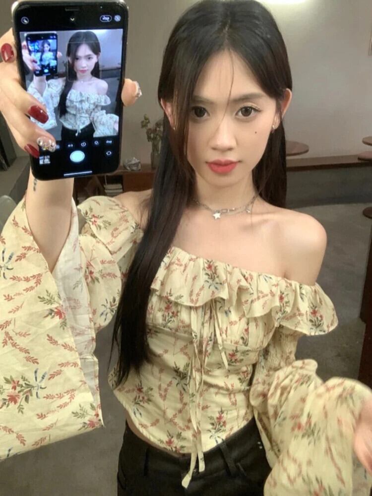 フレンチスイートホットガールフリルスラッシュネックシャツ春花柄スリムフィット不規則ボトリングトップ 大人ガーリー スウィート キュート カジュアル スプリング 春物