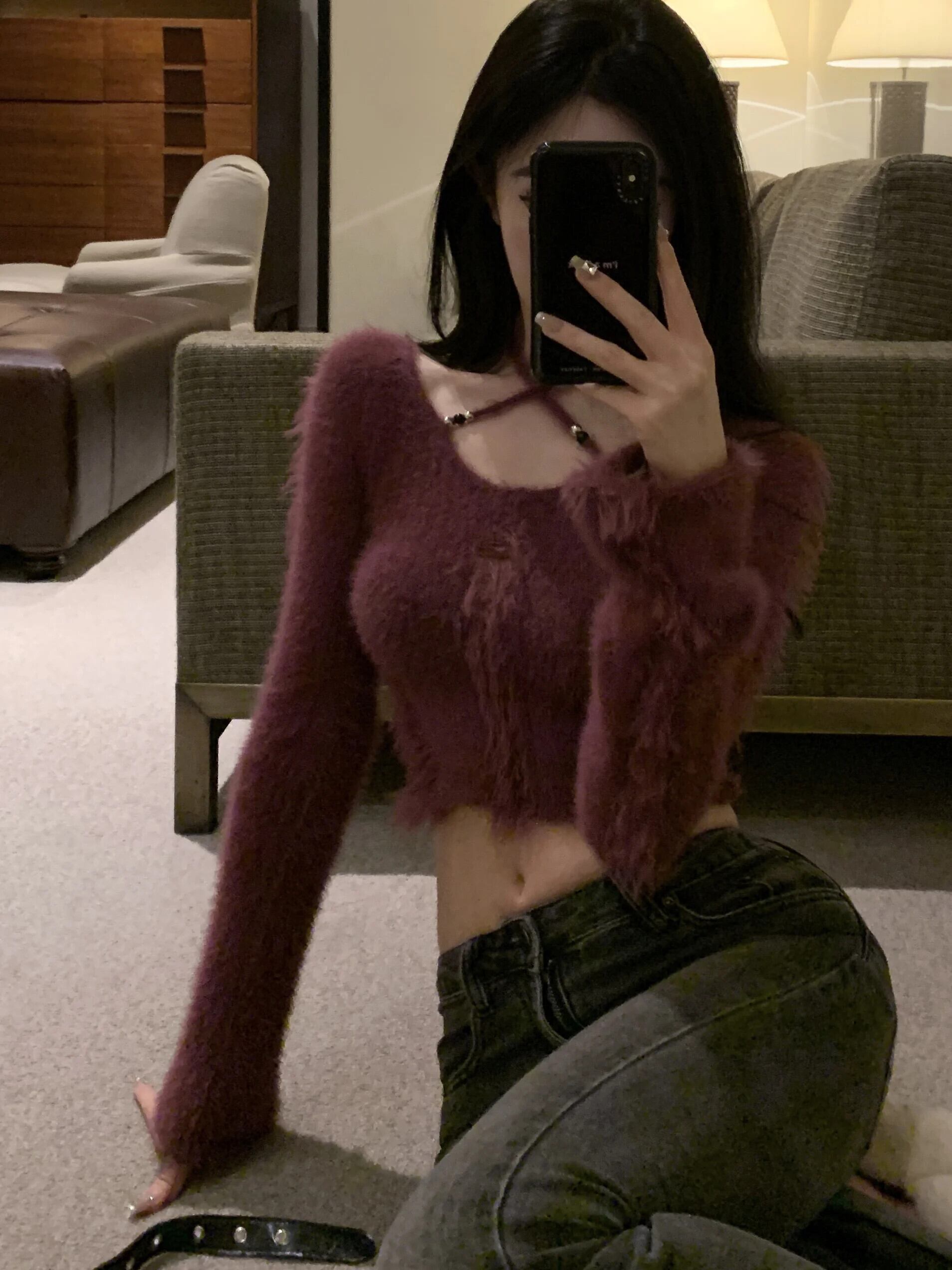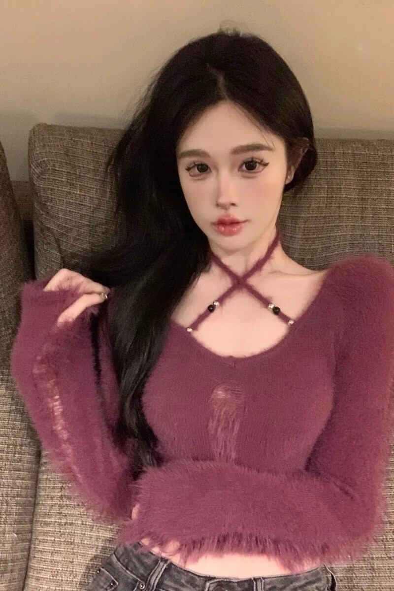甘いホットガールパープルセクシーニット秋と冬スリムフィットショートフューリー長袖プルオーバー ロング 大人ガーリー スウィート キュート カジュアル オータム 秋物 ウィンター 冬物
