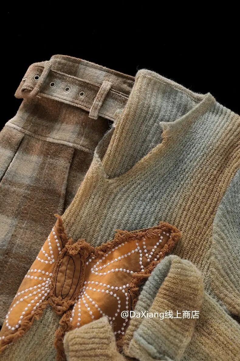 甘いホットガールレトロスーツ春蝶パッチセーターチェック柄ウールスカートツーピースセット 大人ガーリー スウィート キュート カジュアル スプリング 春物
