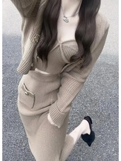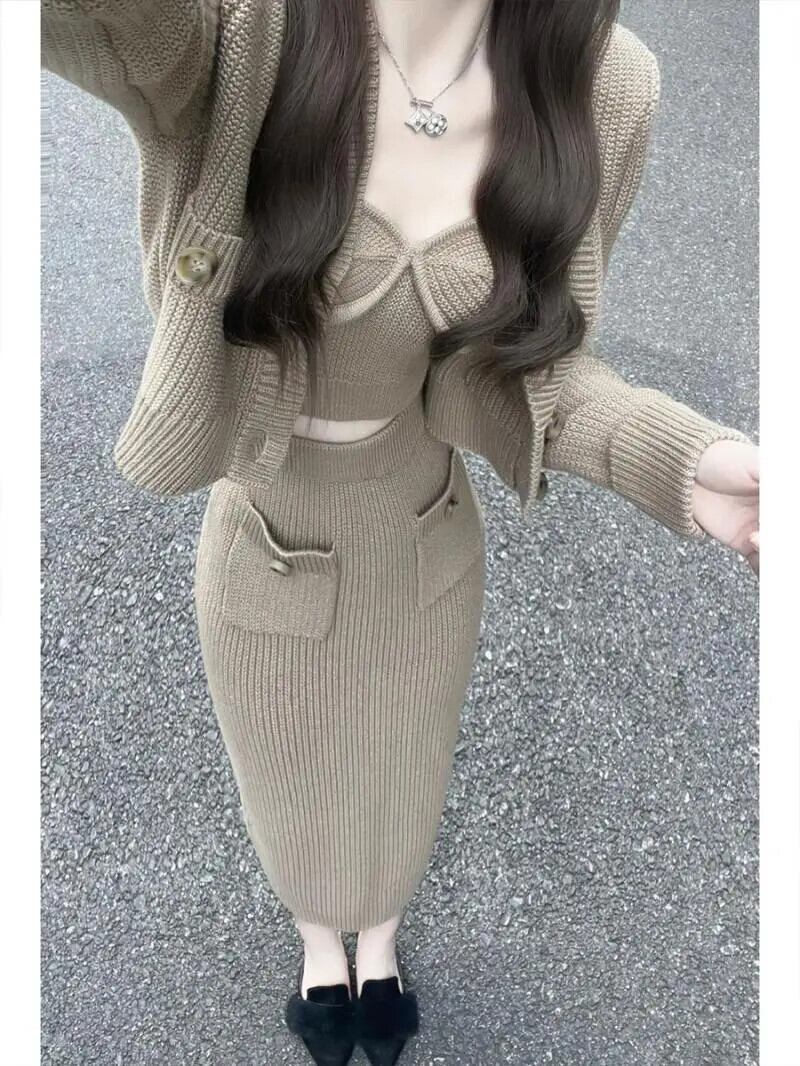 フレンチホットガールスーツ春ニットカーディガンストラップベストトップロングスカート 3 点セット スプリング 春物