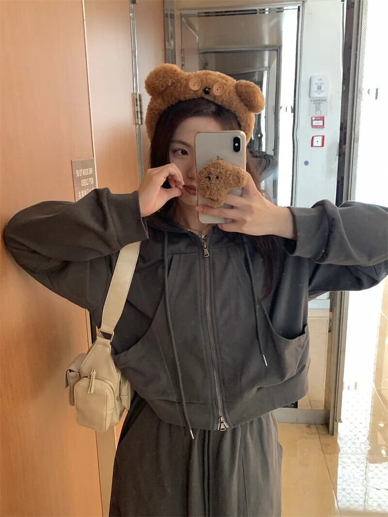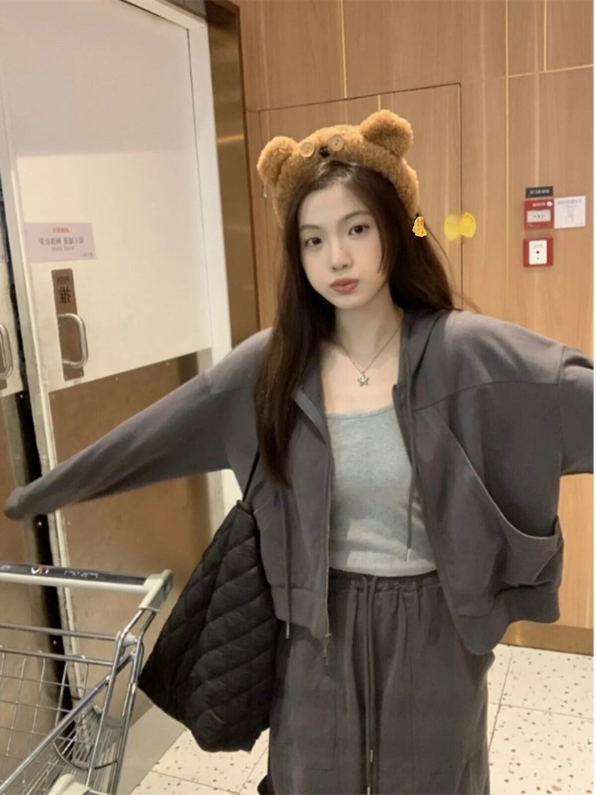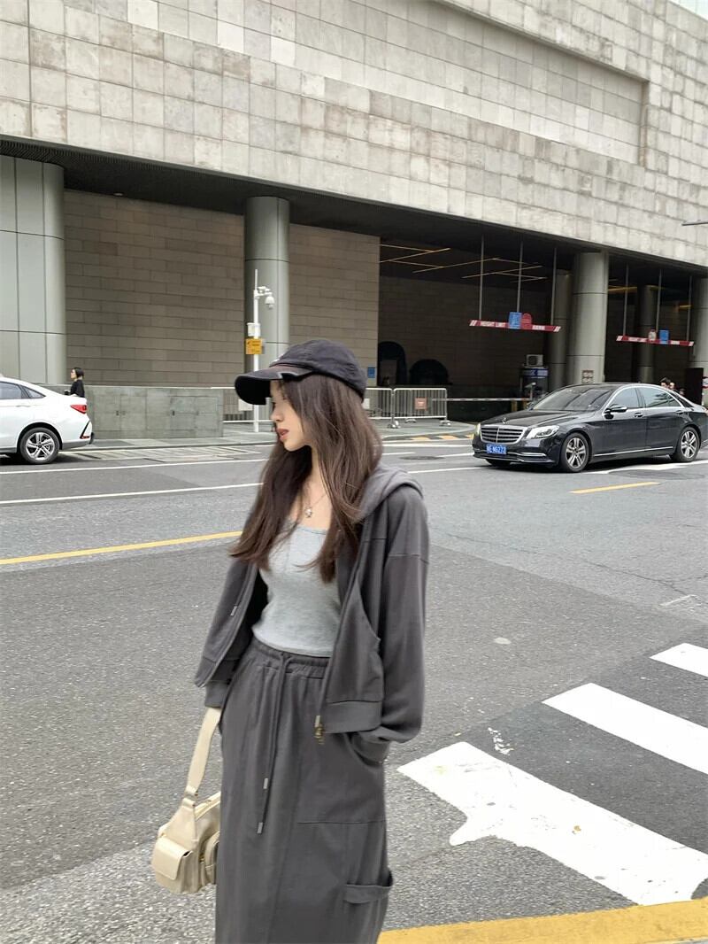 ホットガールレトロスポーツスーツ春グレーフード付きセーターコートウエストロングスカートツーピースセット スプリング 春物