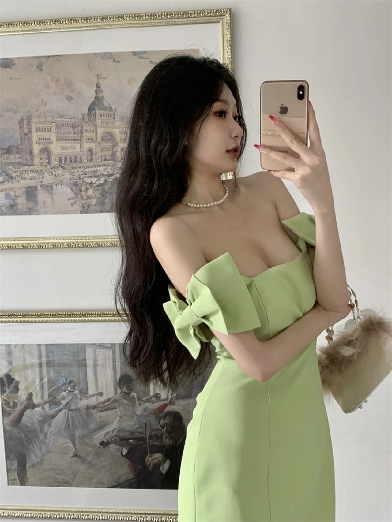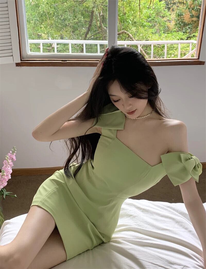 フレンチスイートホットガールソリッドボウストラップドレスビーチ休暇スタイルスクエアカラースリムショートドレス リボン 大人ガーリー スウィート キュート カジュアル ソリッドカラー スクウェア